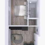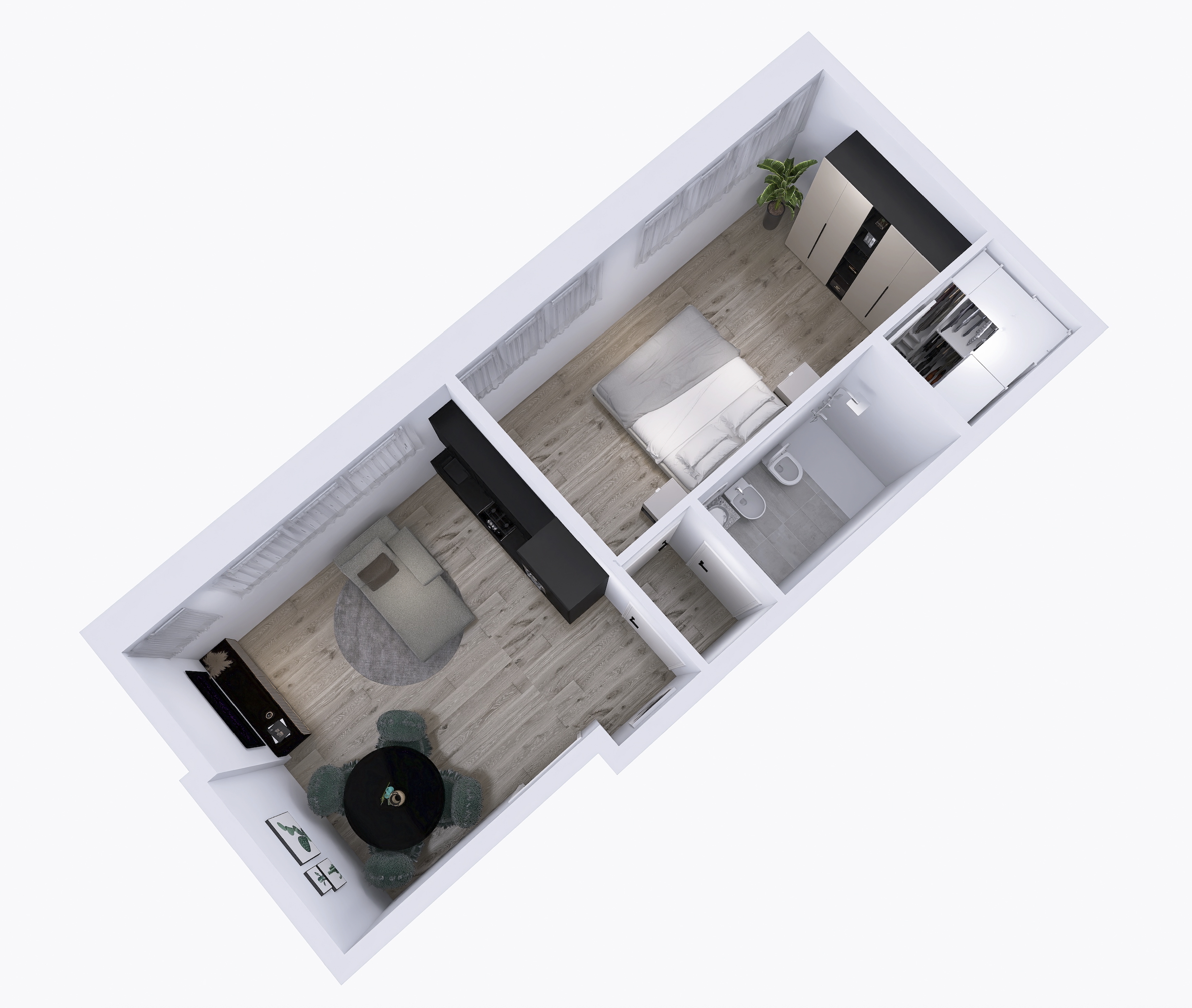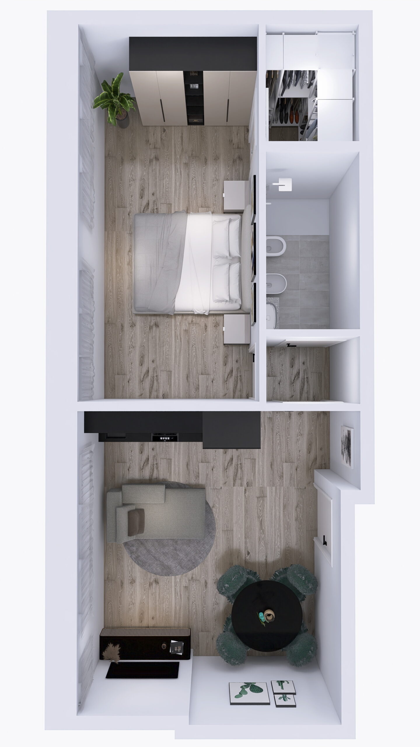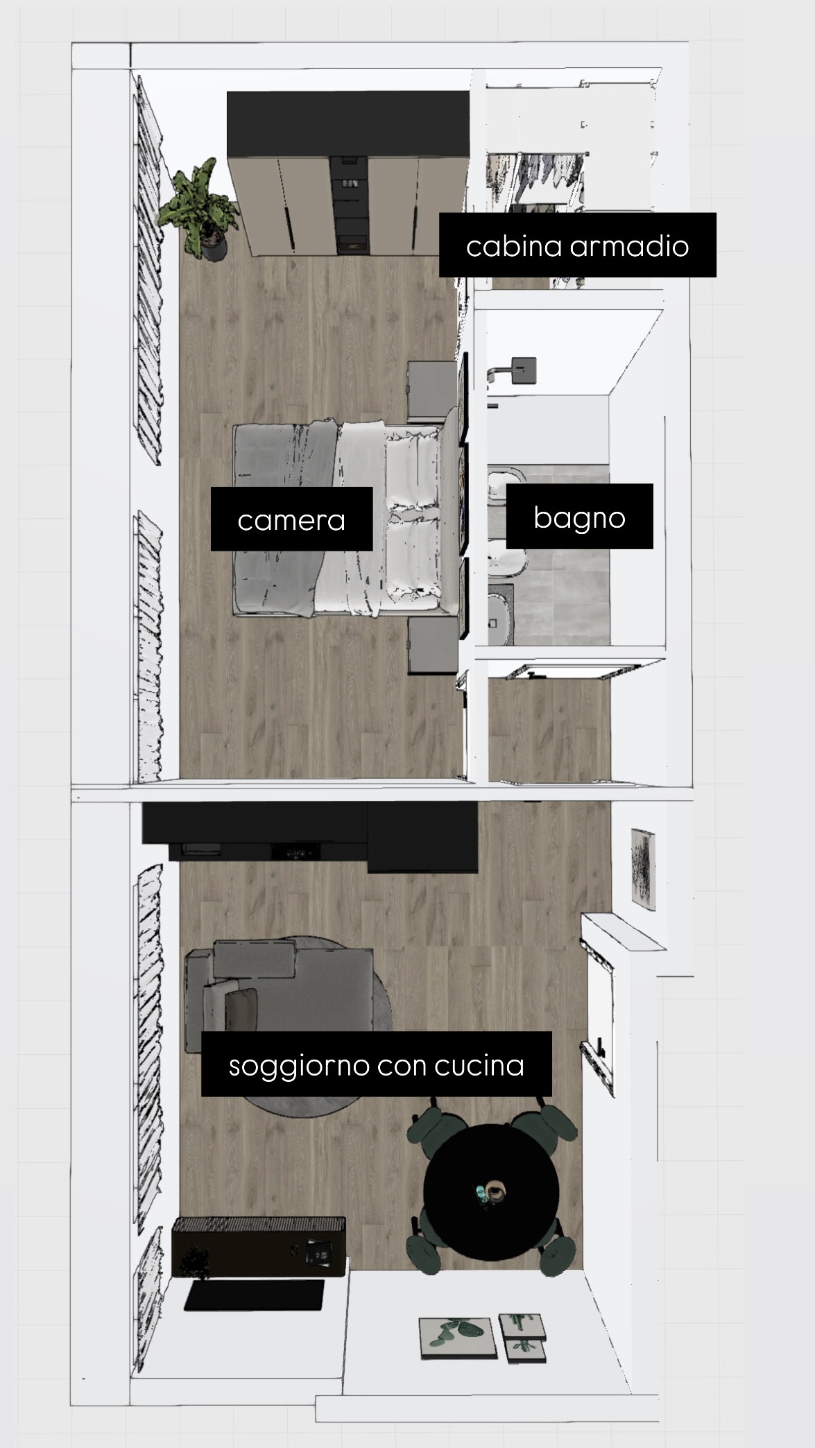 UNITA’ 5 – l’immobile è composto da ingresso, soggiorno con cucina a vista, ampia camera da letto, cabina armadio e bagno con doccia