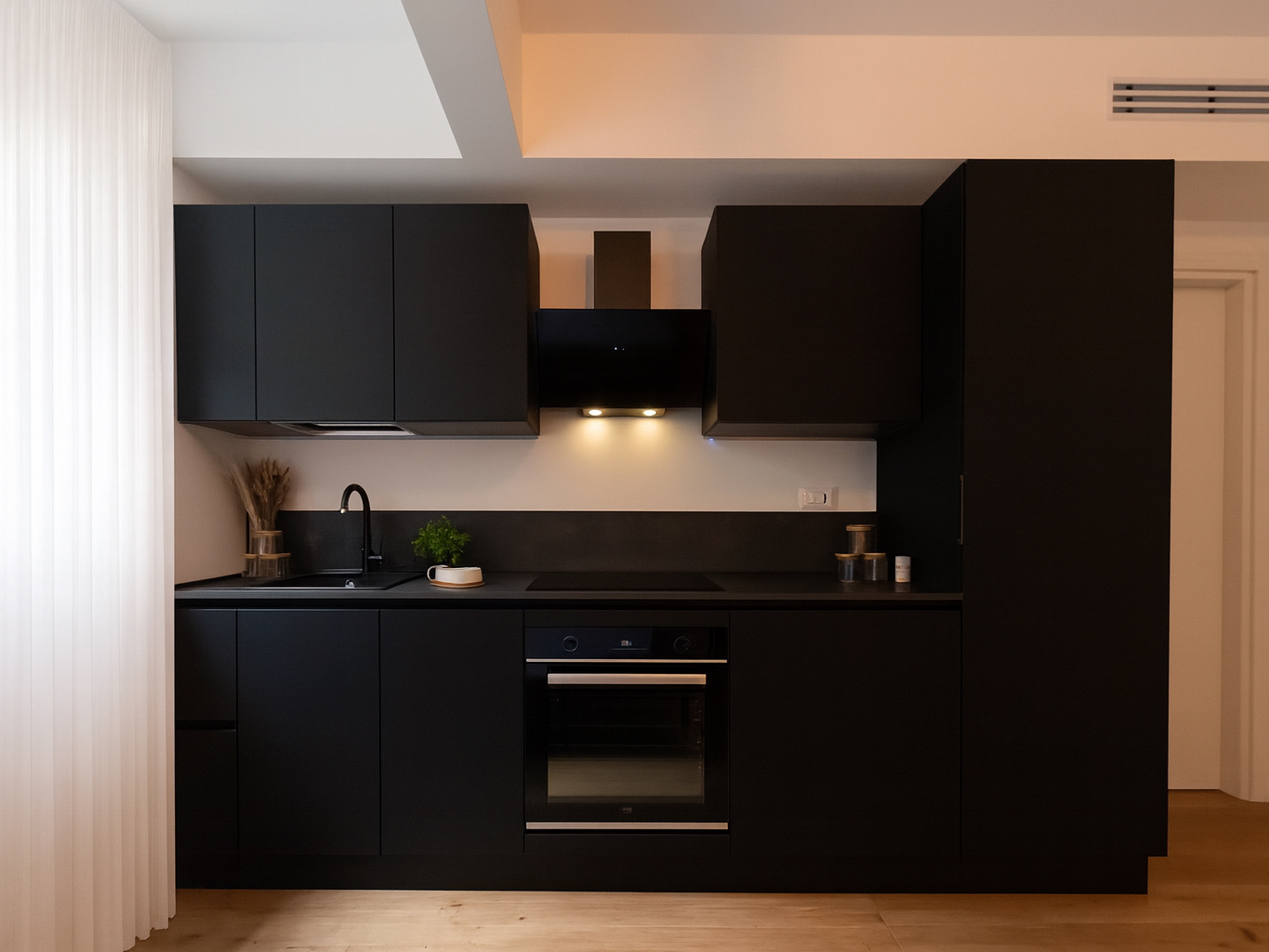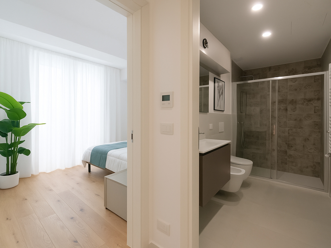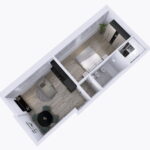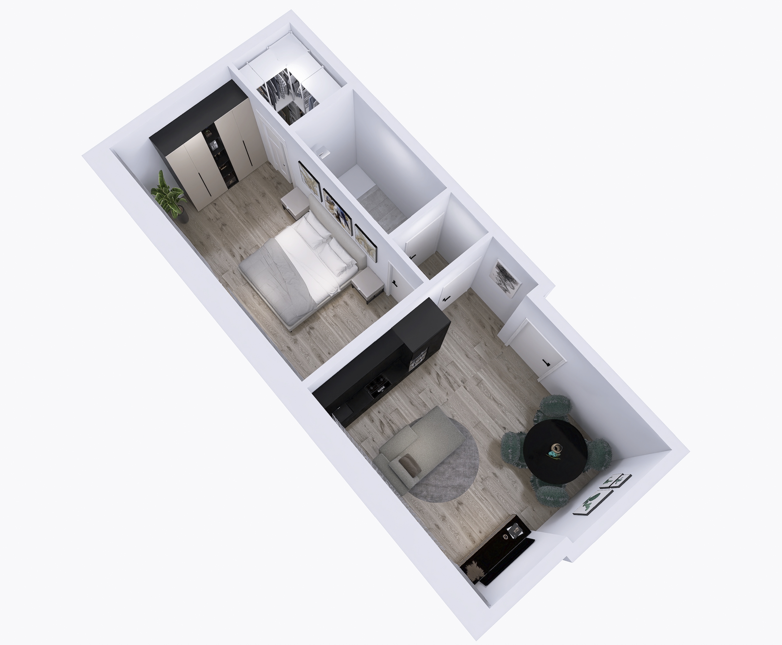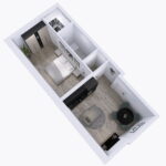 UNITA’ 5 – l’immobile è composto da ingresso, soggiorno con cucina a vista, ampia camera da letto, cabina armadio e bagno con doccia