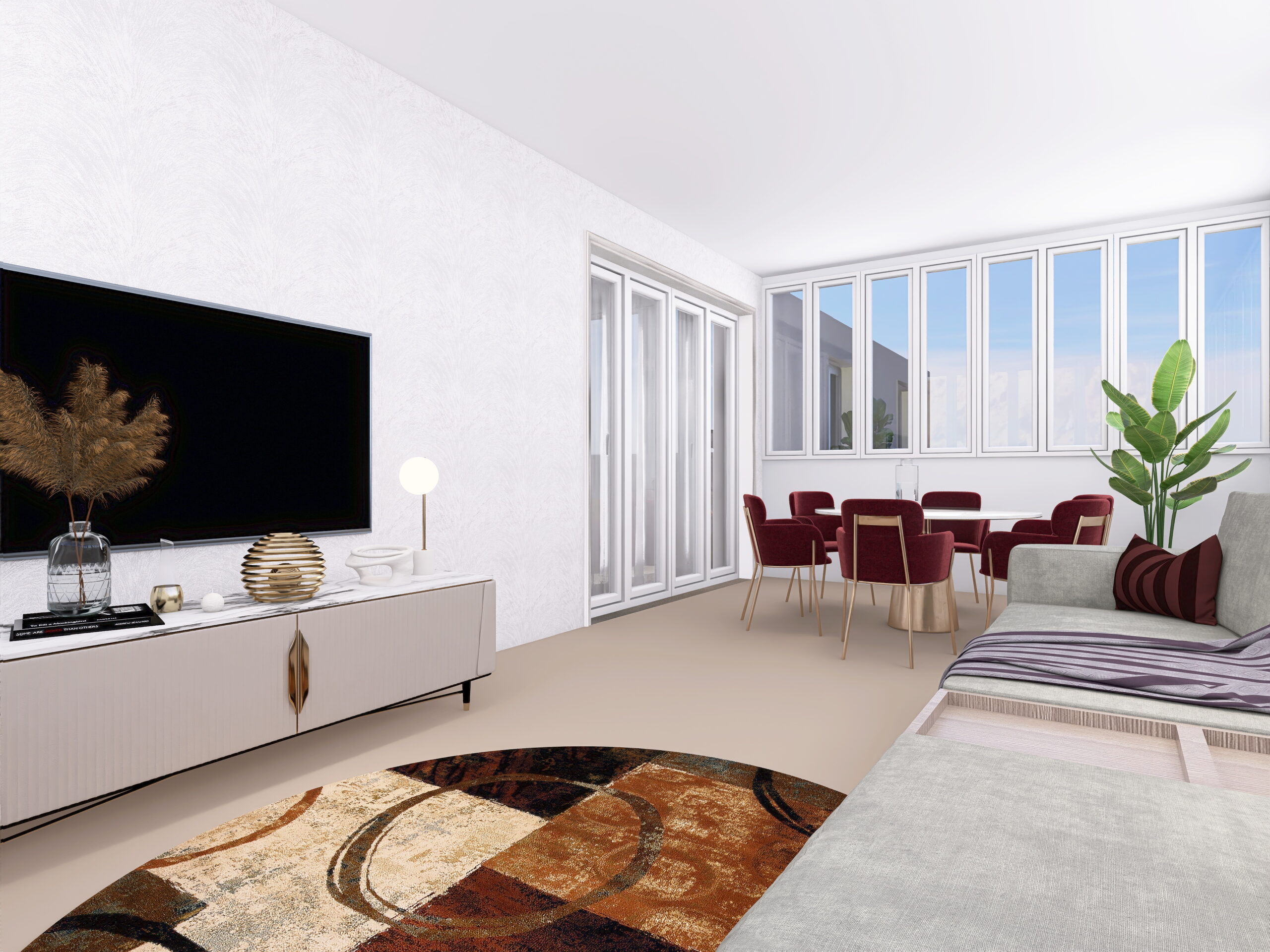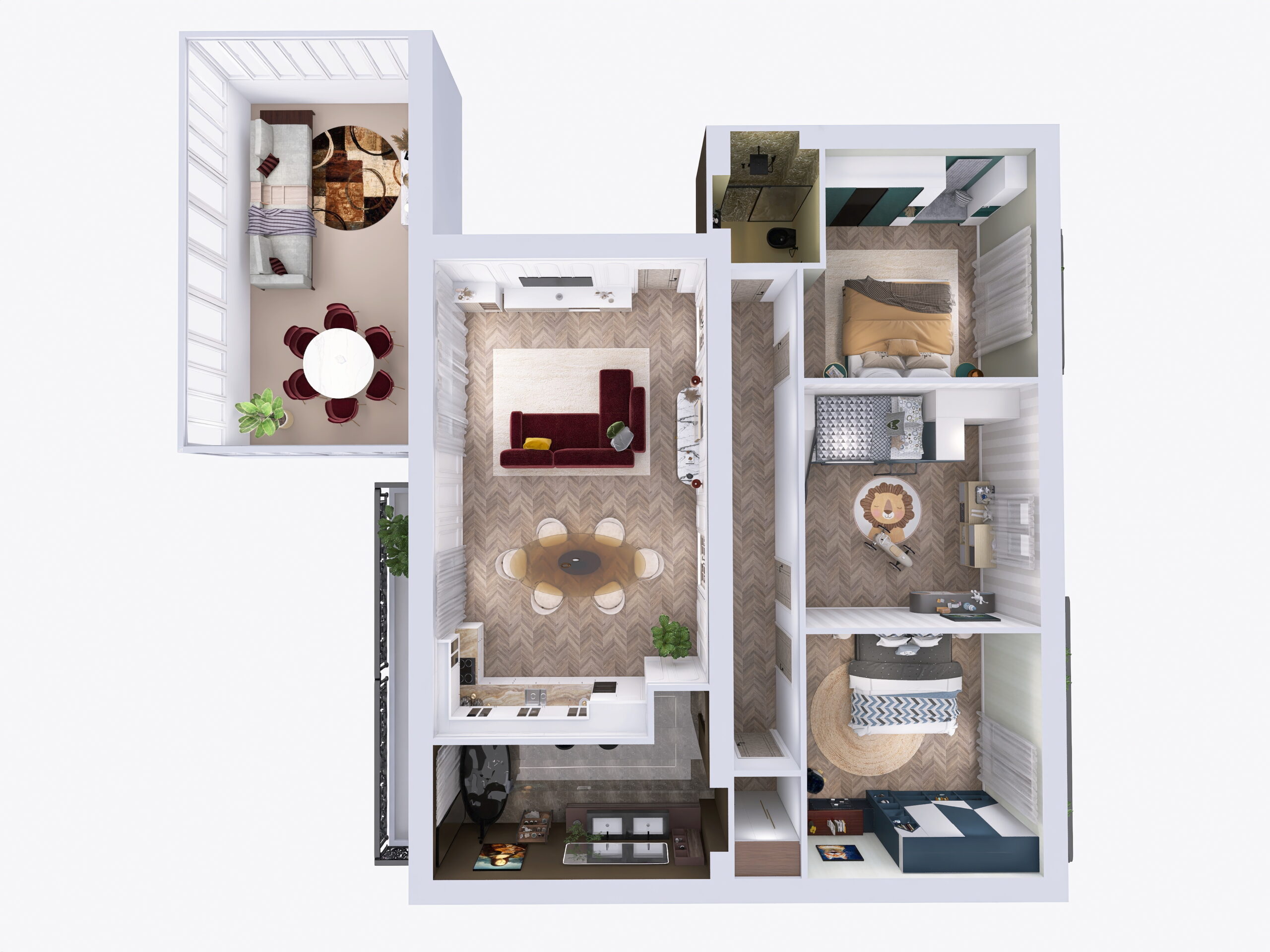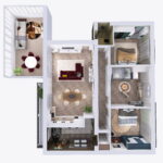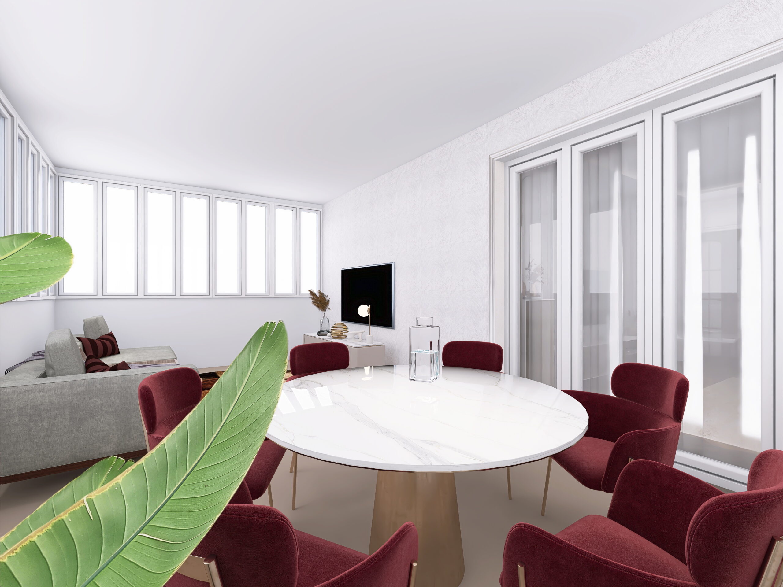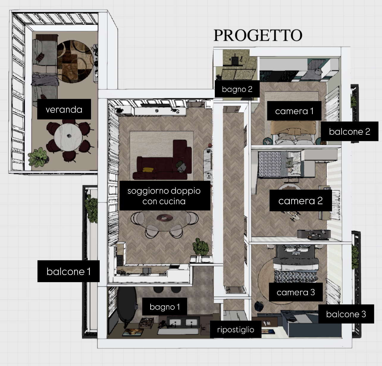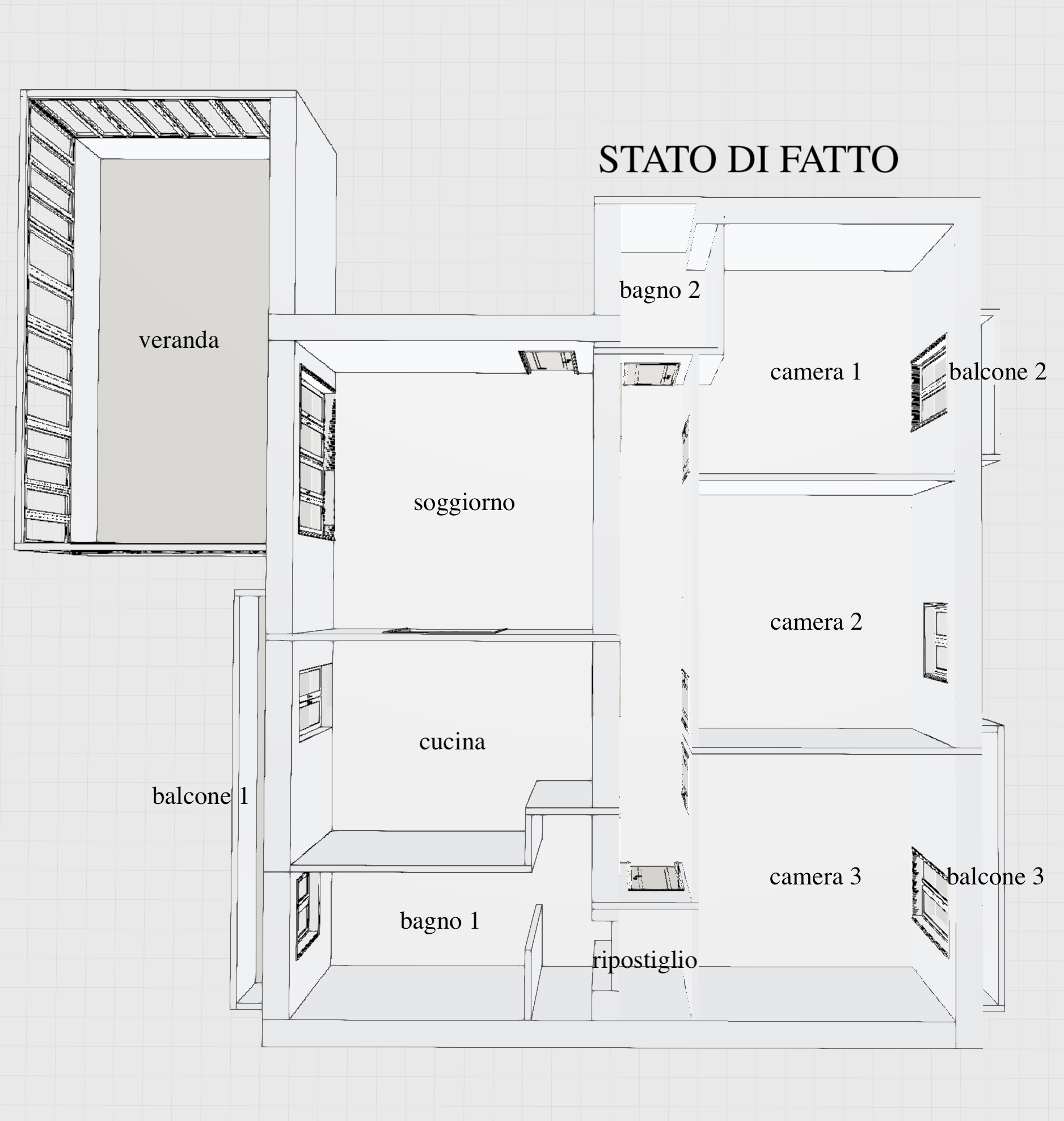 il progetto prevede la suddivisione degli spazi interni (vedi progetto pubblicato) in soggiorno doppio con cucina a vista ed accesso diretto al balcone 1 e alla veranda, camera matrimoniale 1 con accesso diretto al balcone 2, camera matrimoniale 2, camera matrimoniale 3 con accesso al balcone 3, bagno 1 finestrato, bagno 2 cieco e ripostiglio