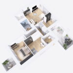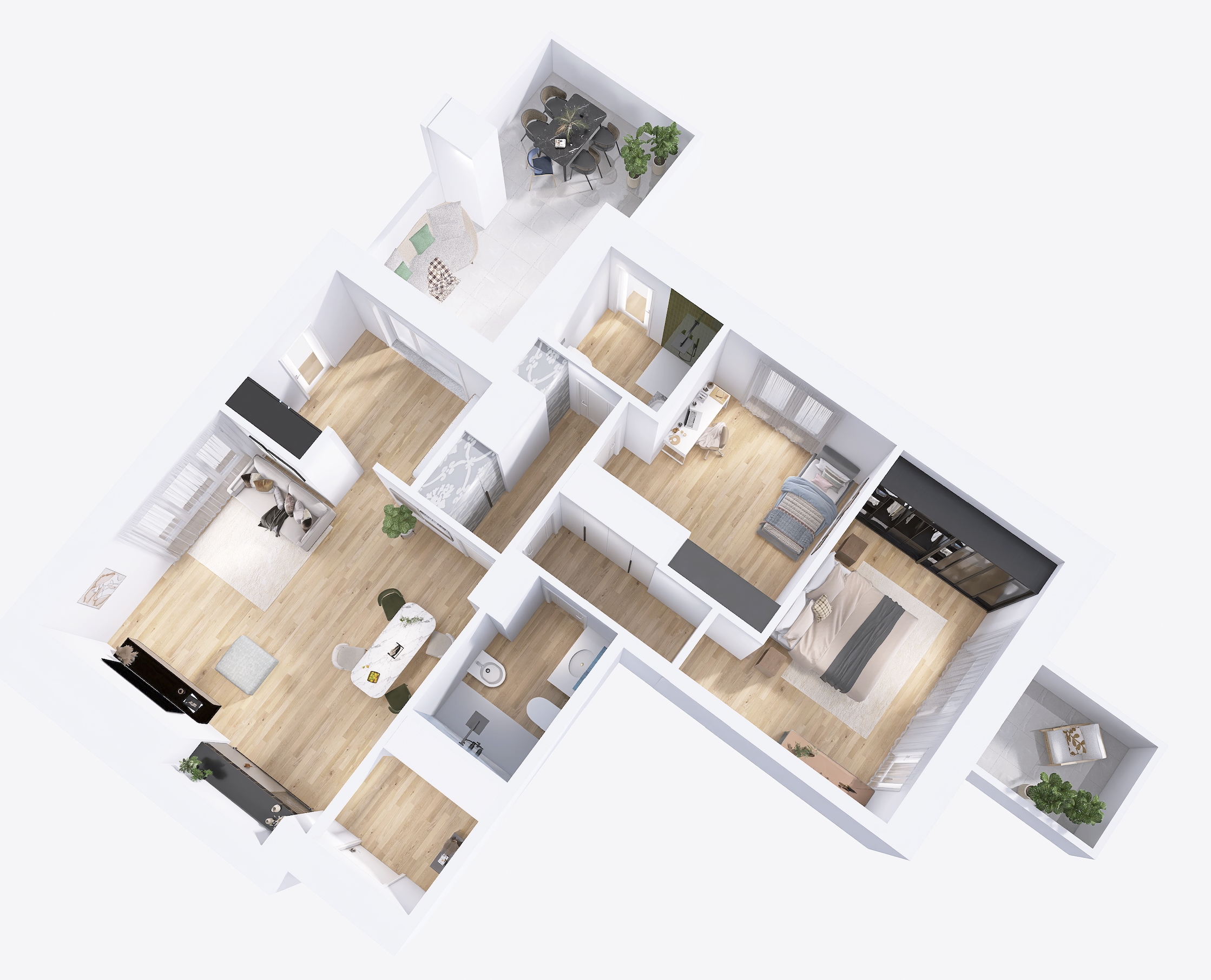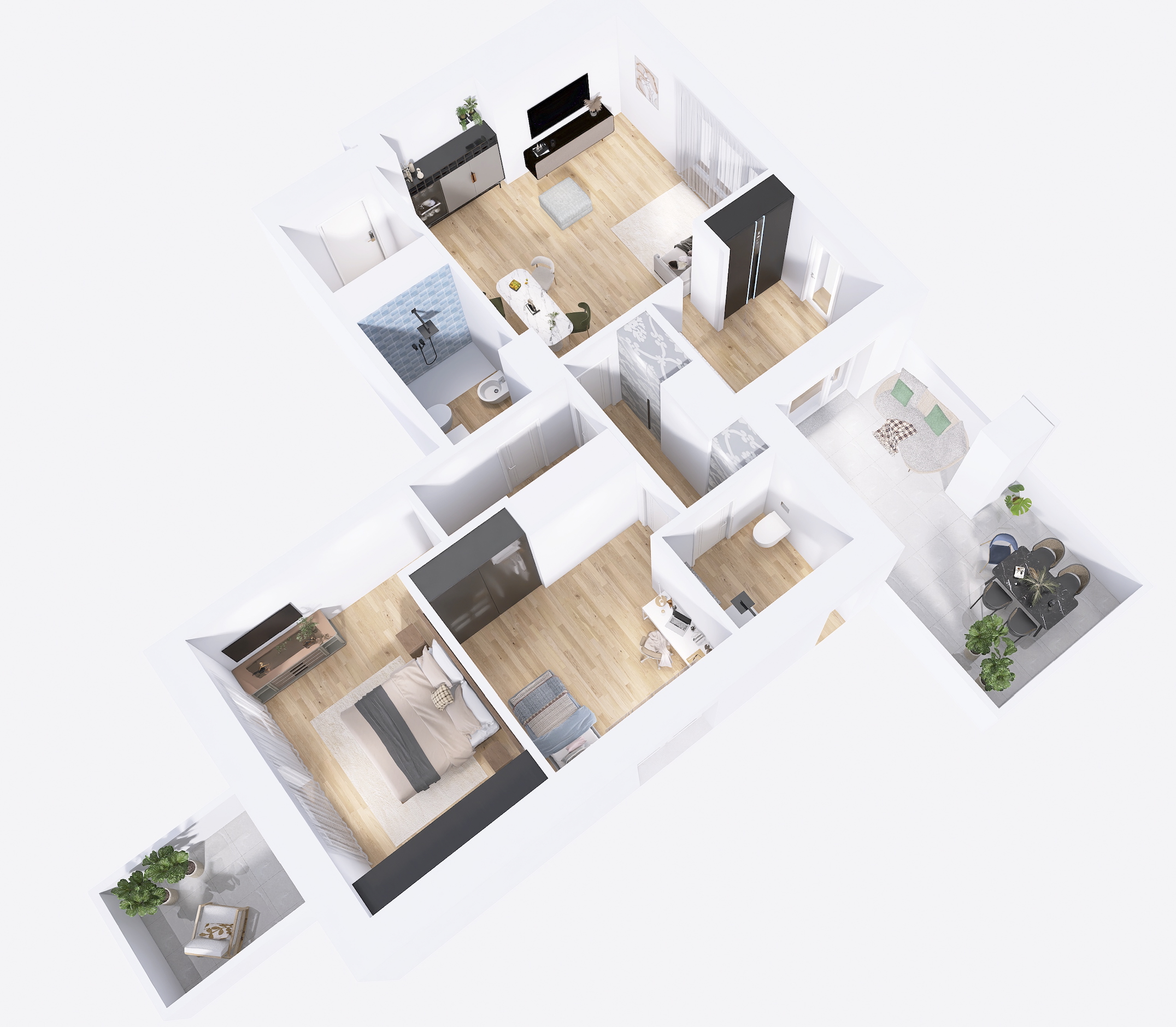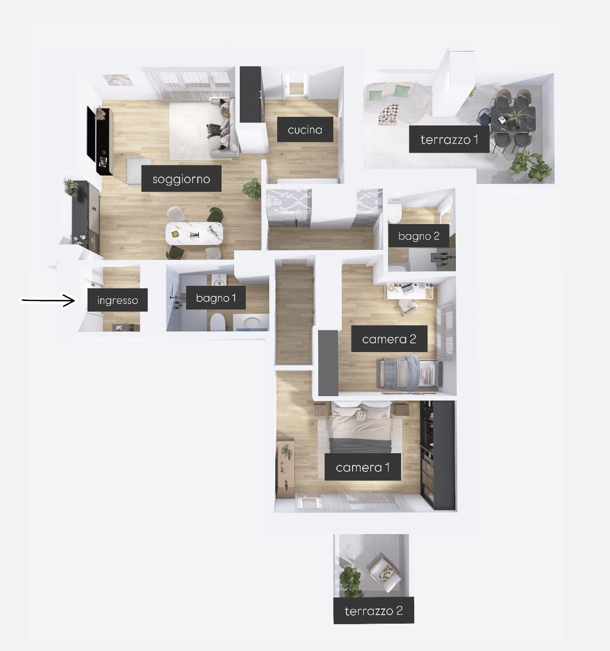 l’immobile è composto da ingresso, soggiorno, cucina separata con accesso diretto al terrazzo 1, camera da letto 1 con accesso diretto al terrazzo 2, bagno 1 con doccia, camera da letto 2 e bagno 2 finestrato con doccia