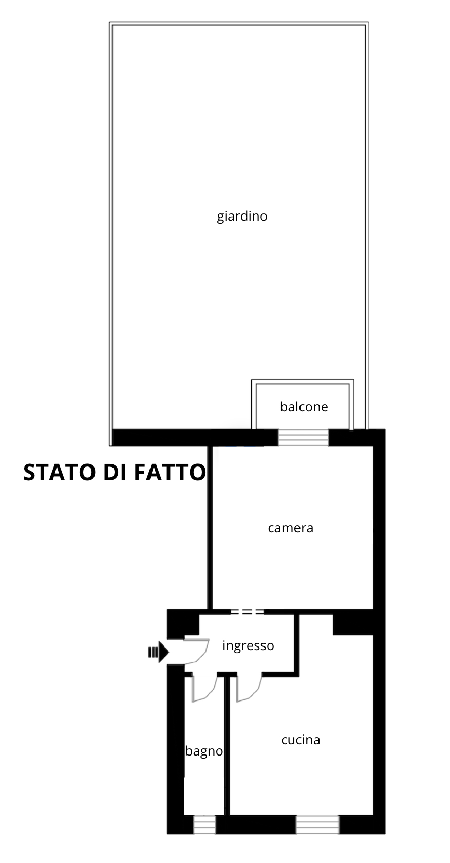 l’immobile è attualmente composto da disimpegno d’ingresso, soggiorno con cucinotto, ampia camera da letto con accesso diretto al giardino privato di 48 mq e bagno finestrato