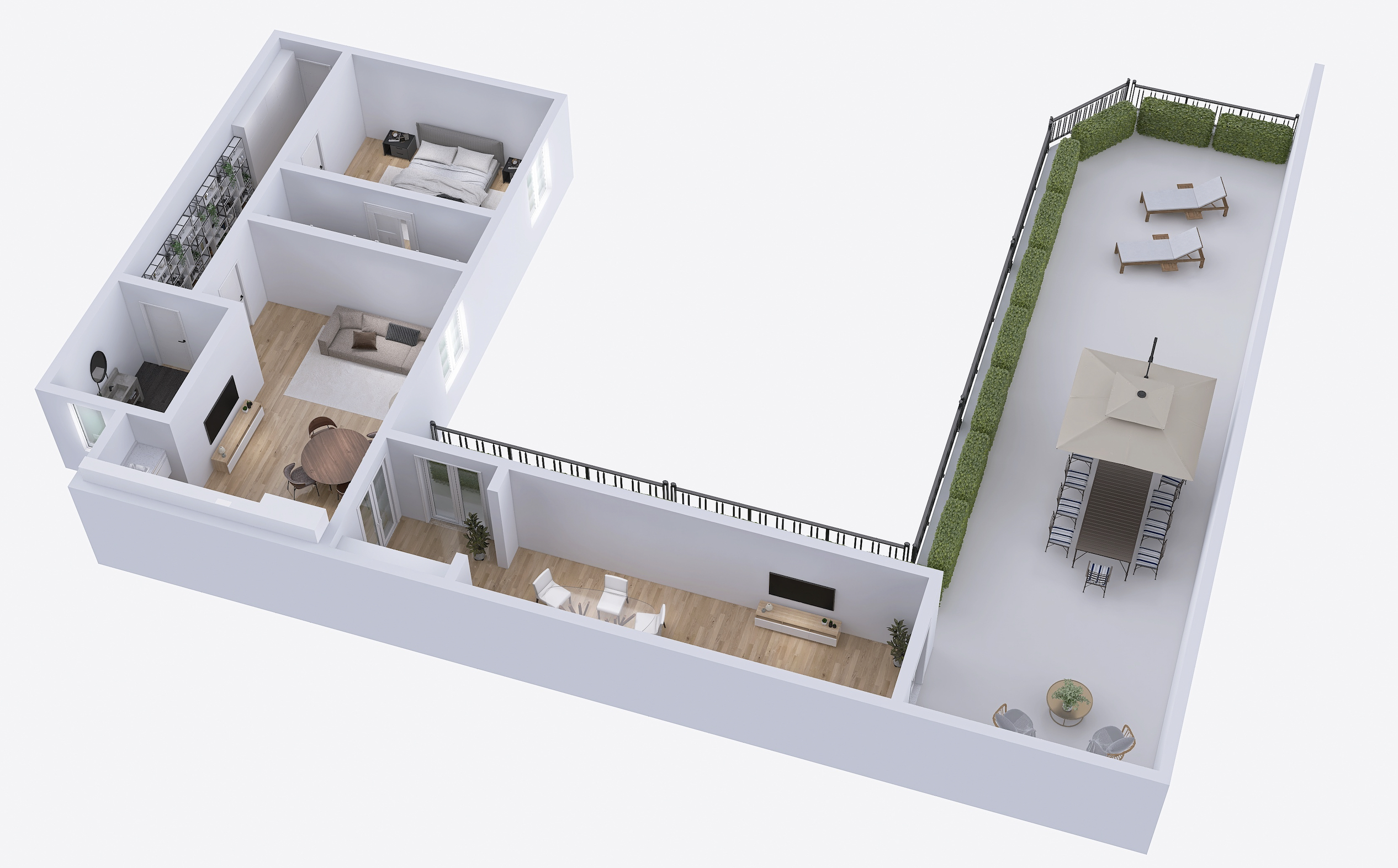 Il terrazzo loggiato permette la suddivisione degli spazi esterni in comode zone living-relax e zone dedicate a pranzi o cene all’aperto.