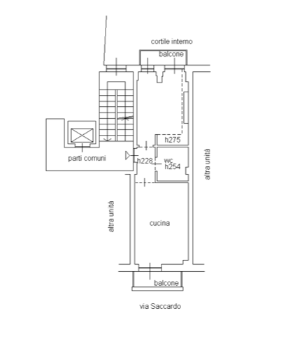 L’immobile è composto da ingresso, soggiorno con cucina a vista e balcone con affaccio esterno, bagno e camera da letto matrimoniale con balcone sull’interno dello stabile.