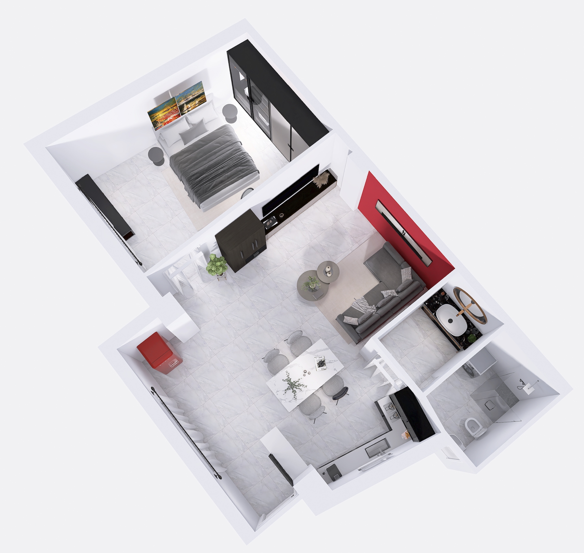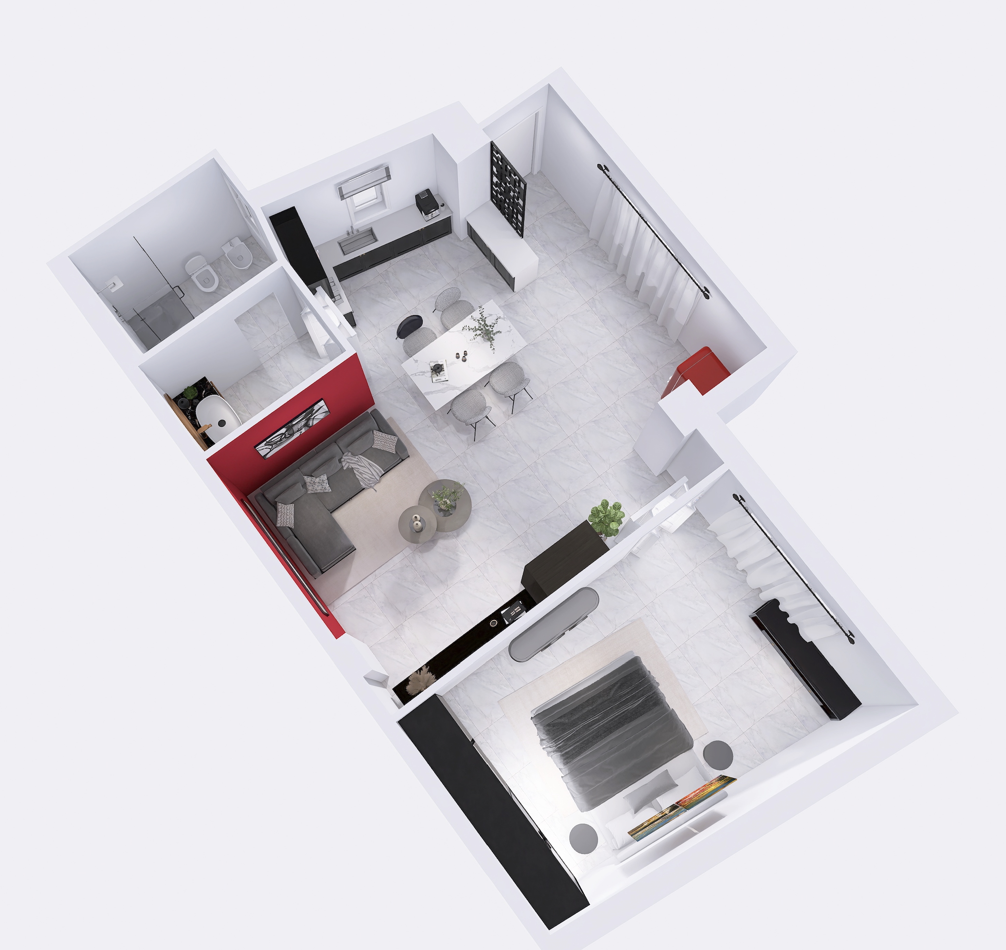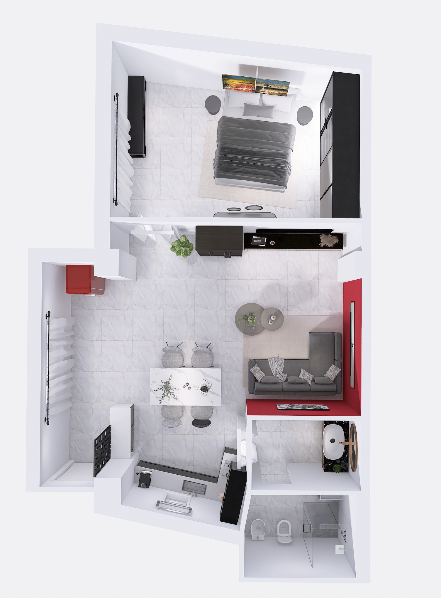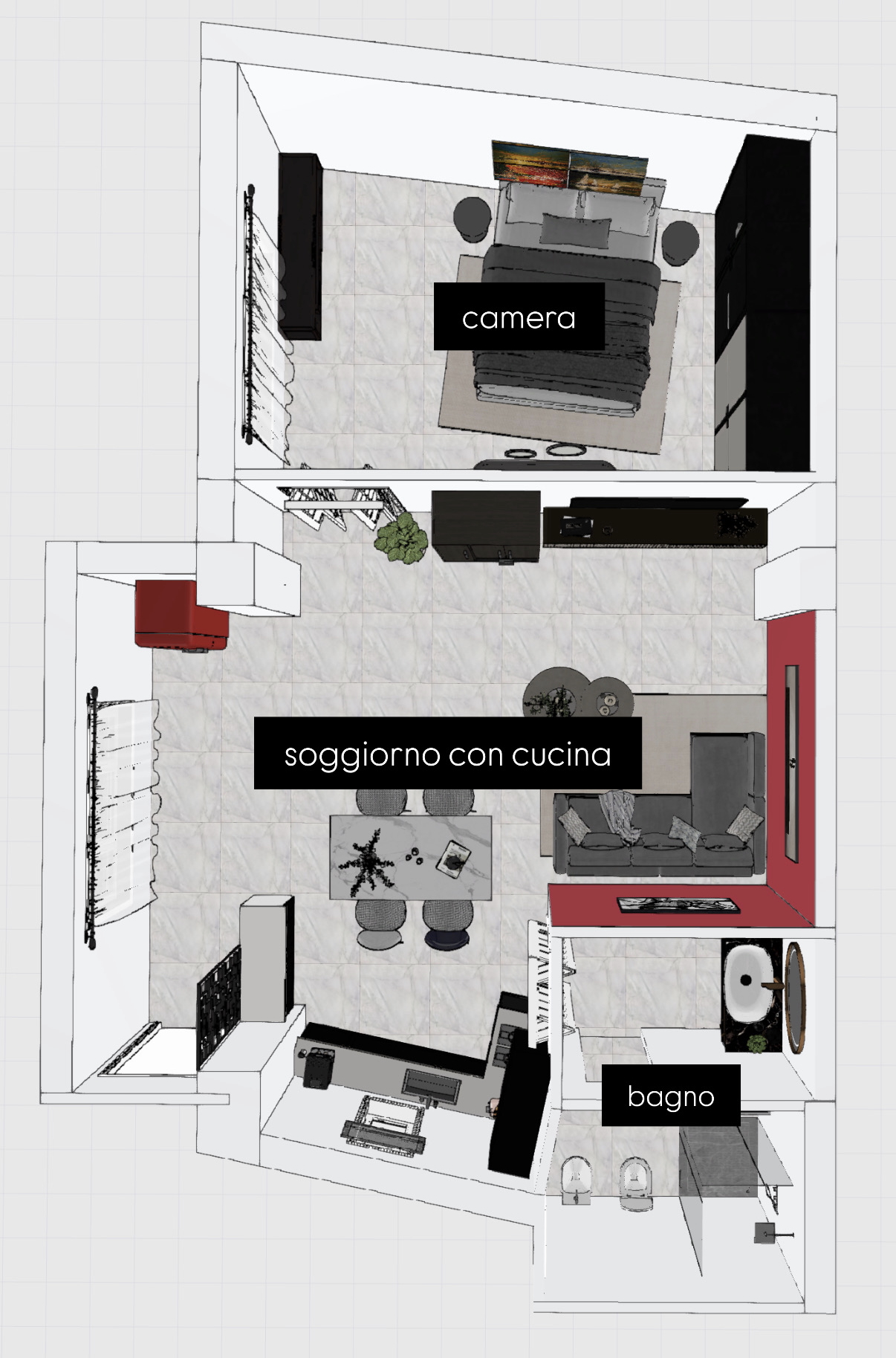 l’immobile è composto da ingresso, ampio soggiorno con cucina a vista, camera matrimoniale e bagno finestrato con doccia