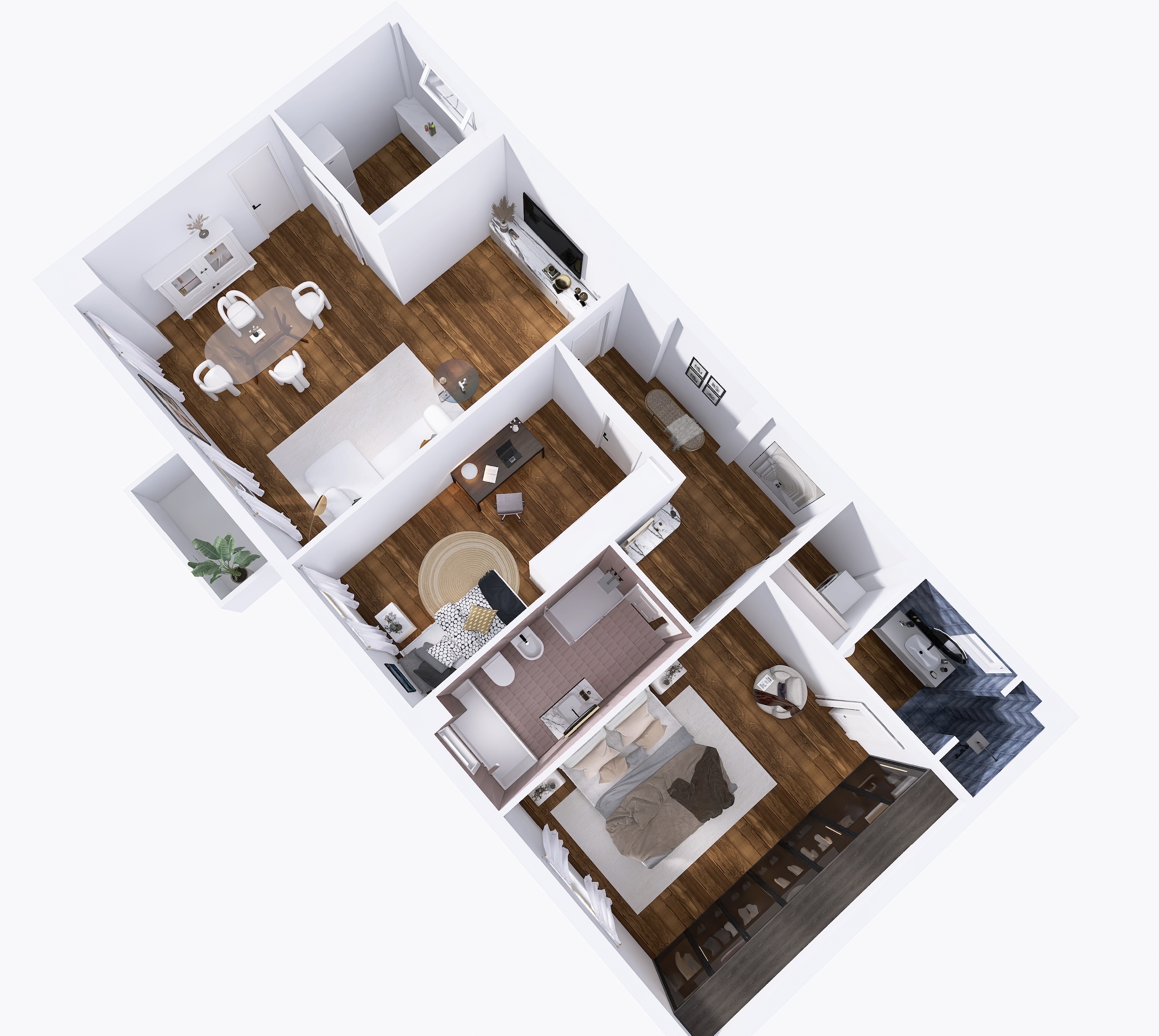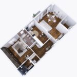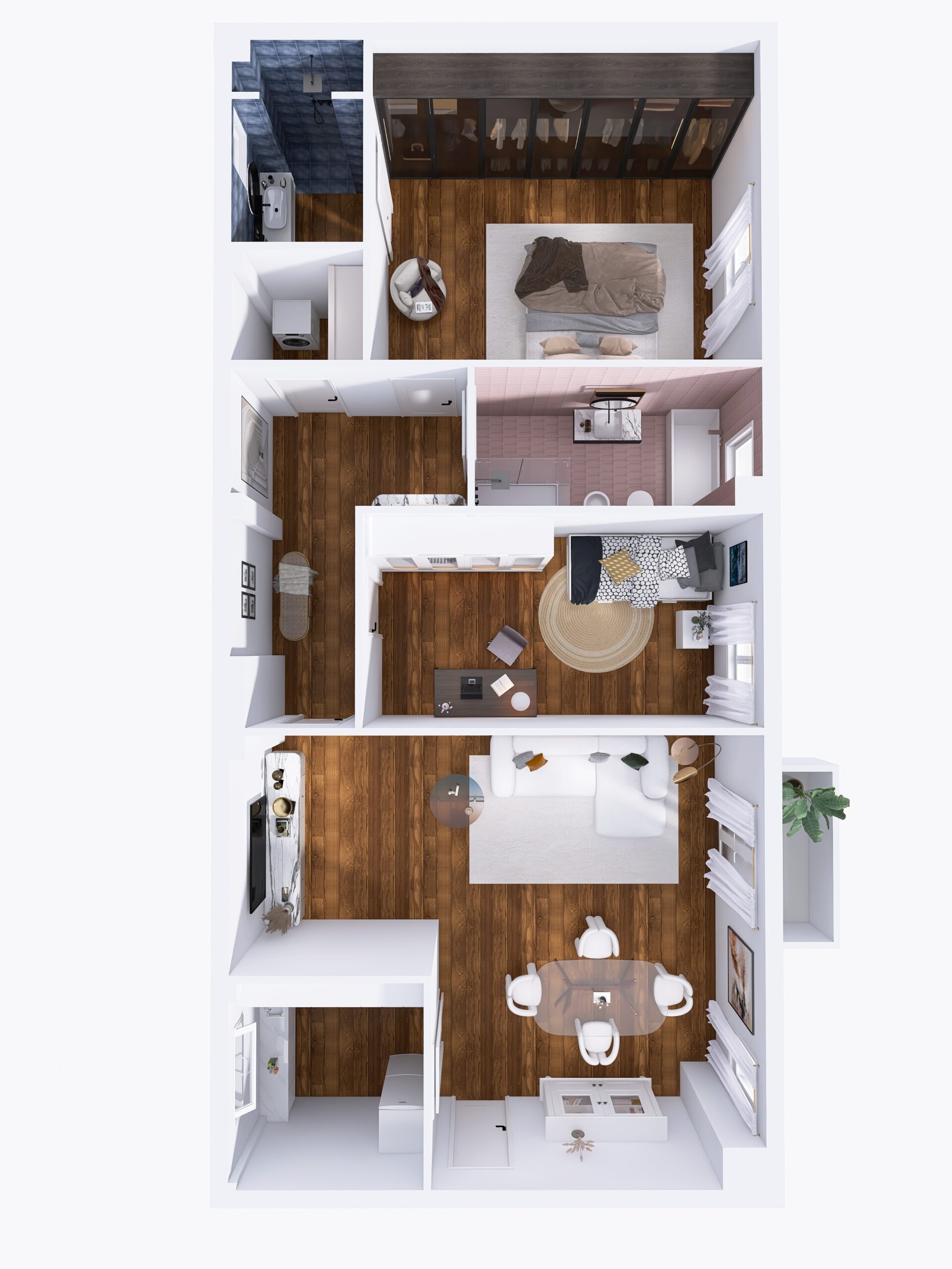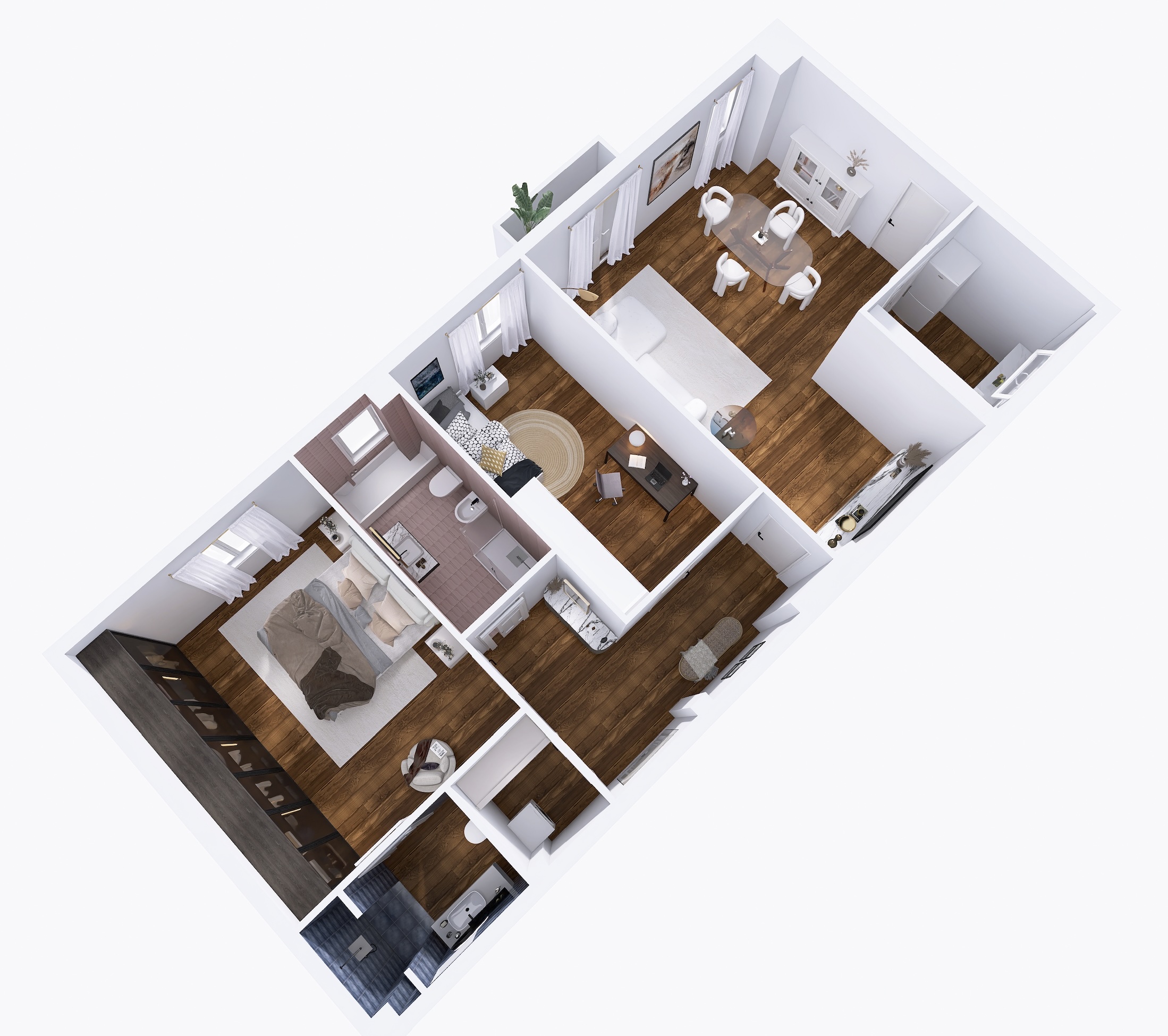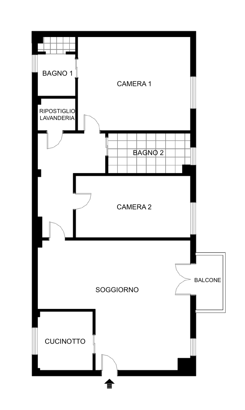 l’immobile è composto da ingresso, soggiorno con accesso diretto al balcone, cucinotto separato e finestrato, camera da letto 1 con bagno 1 en-suite con doccia finestrato, camera da letto 2, bagno 2 finestrato con vasca e doccia e ripostiglio/lavanderia