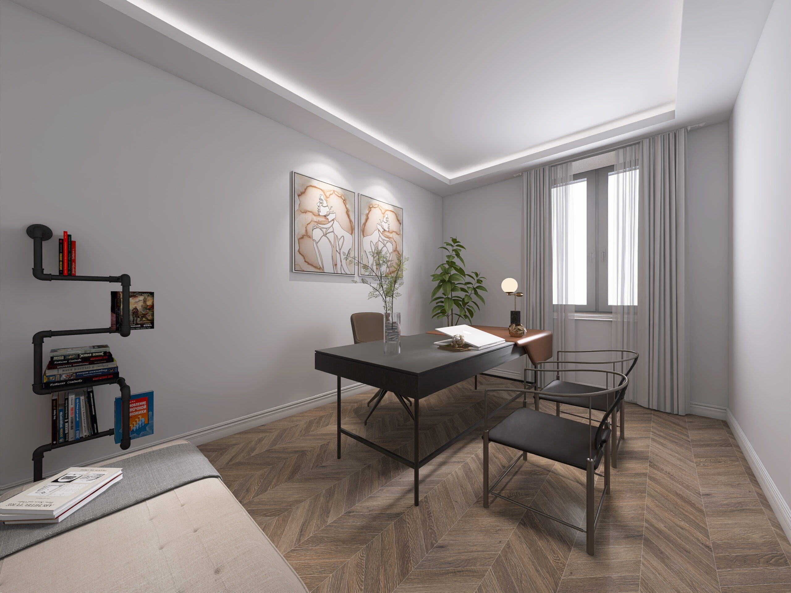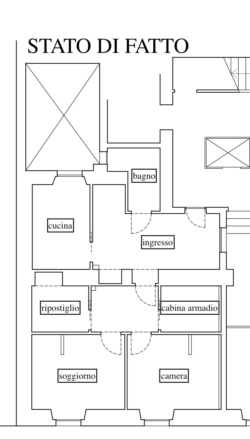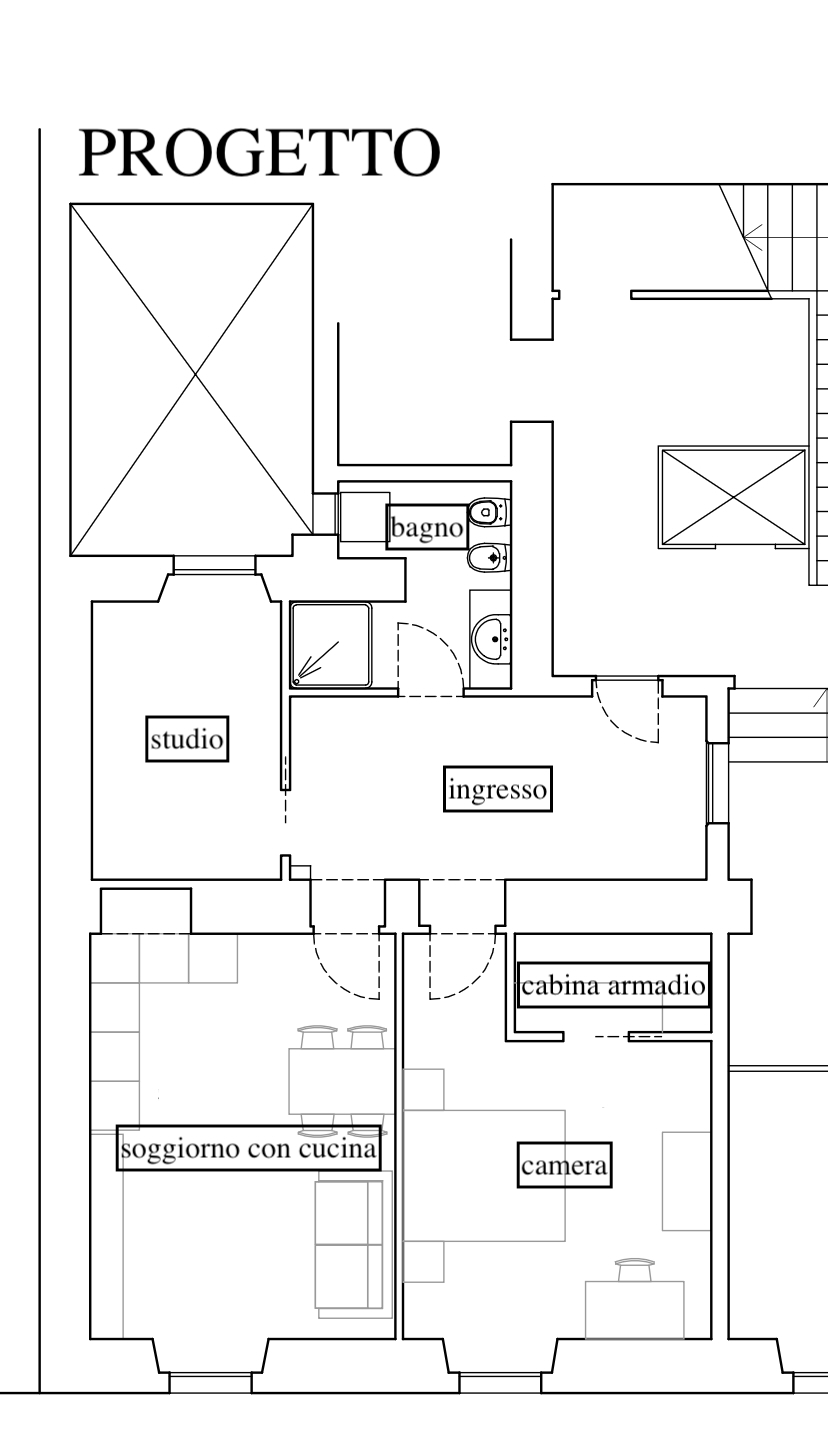 il progetto prevede la suddivisione degli spazi interni (vedi progetto pubblicato) in soggiorno con cucina a vista, camera da letto con cabina armadio, stanza/studio e bagno finestrato