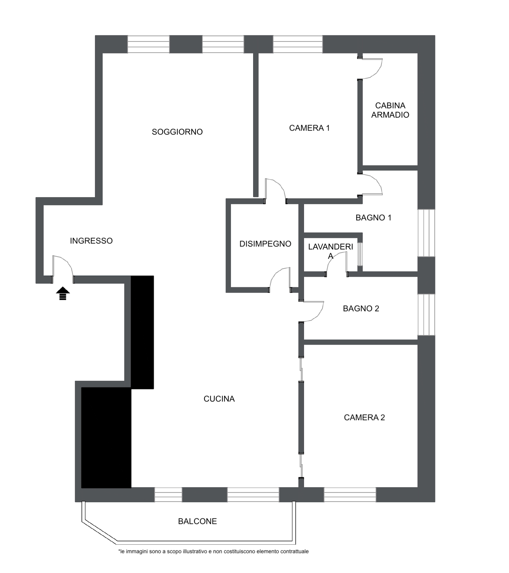 l’immobile è composto da ingresso, soggiorno, cucina abitabile con accesso diretto alla balconata, camera da letto 1 con bagno 1 en-suite con doccia finestrato, camera da letto 2, bagno 2 con vasca finestrato e ripostiglio/lavanderia