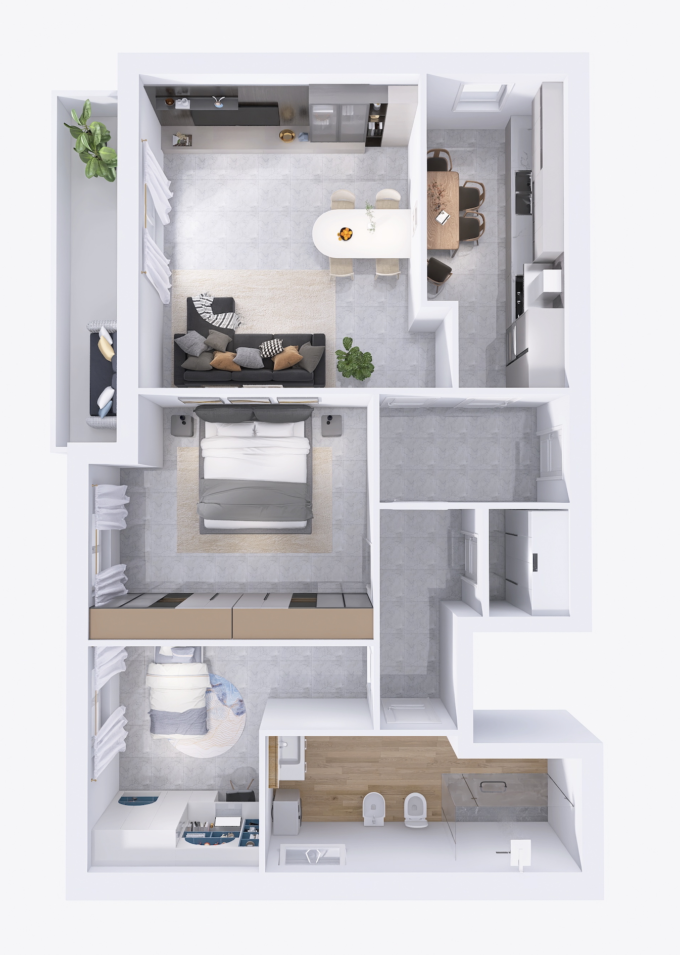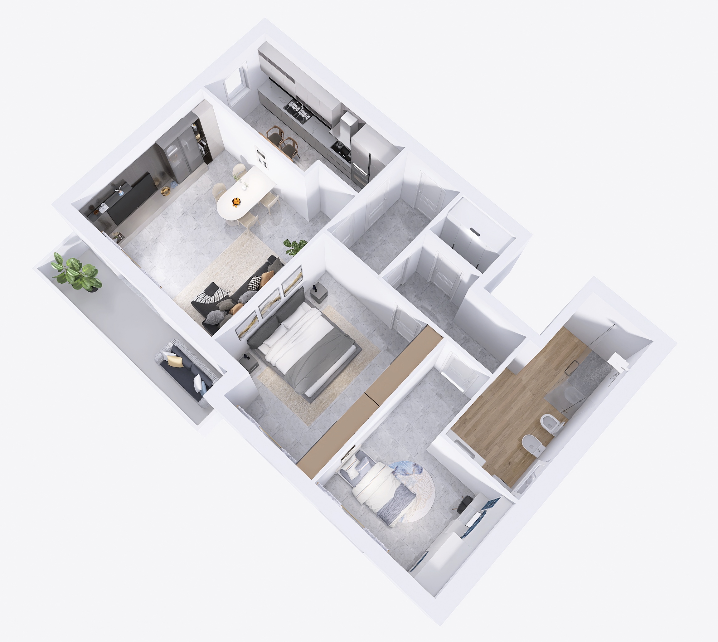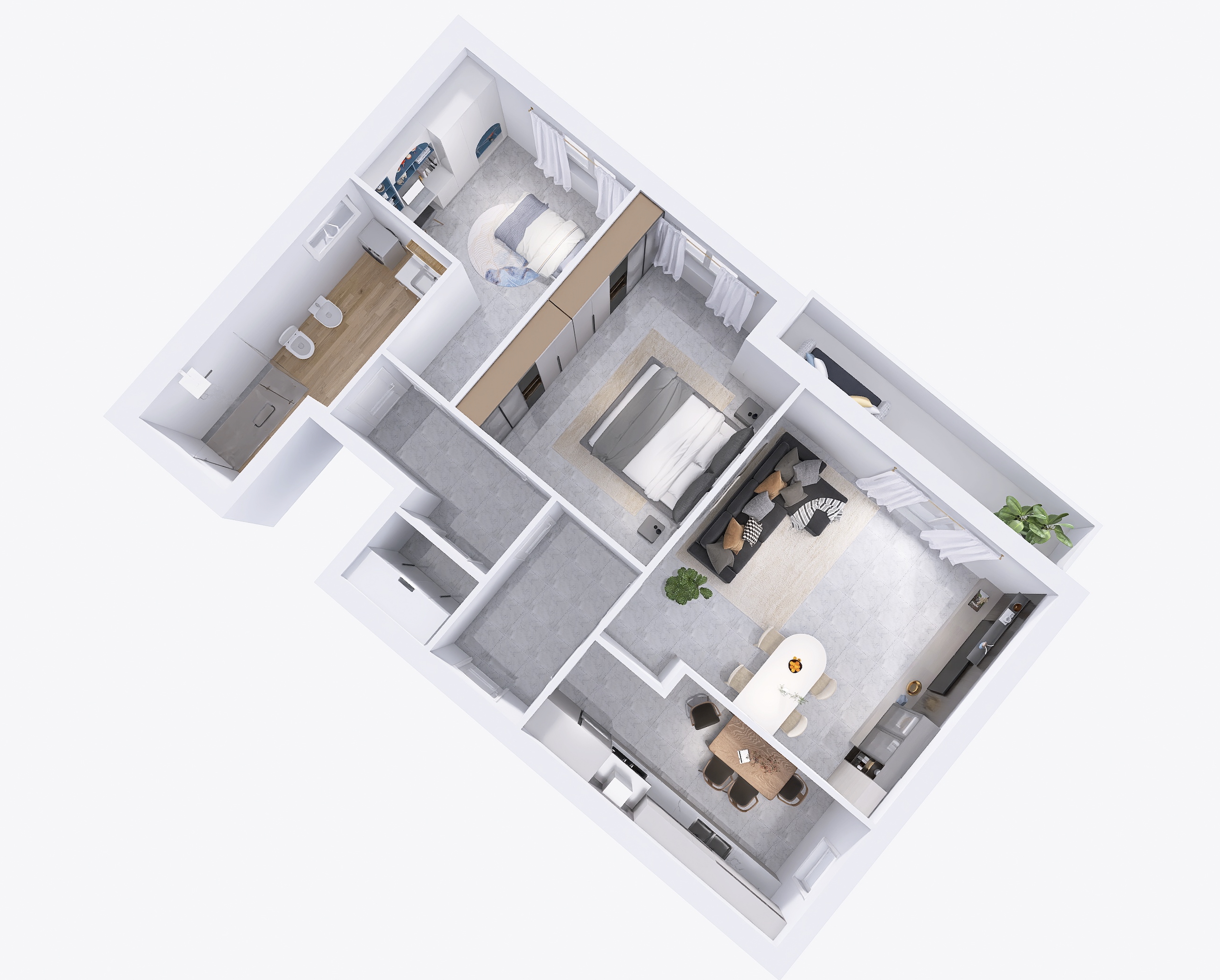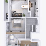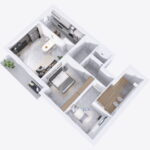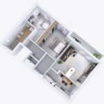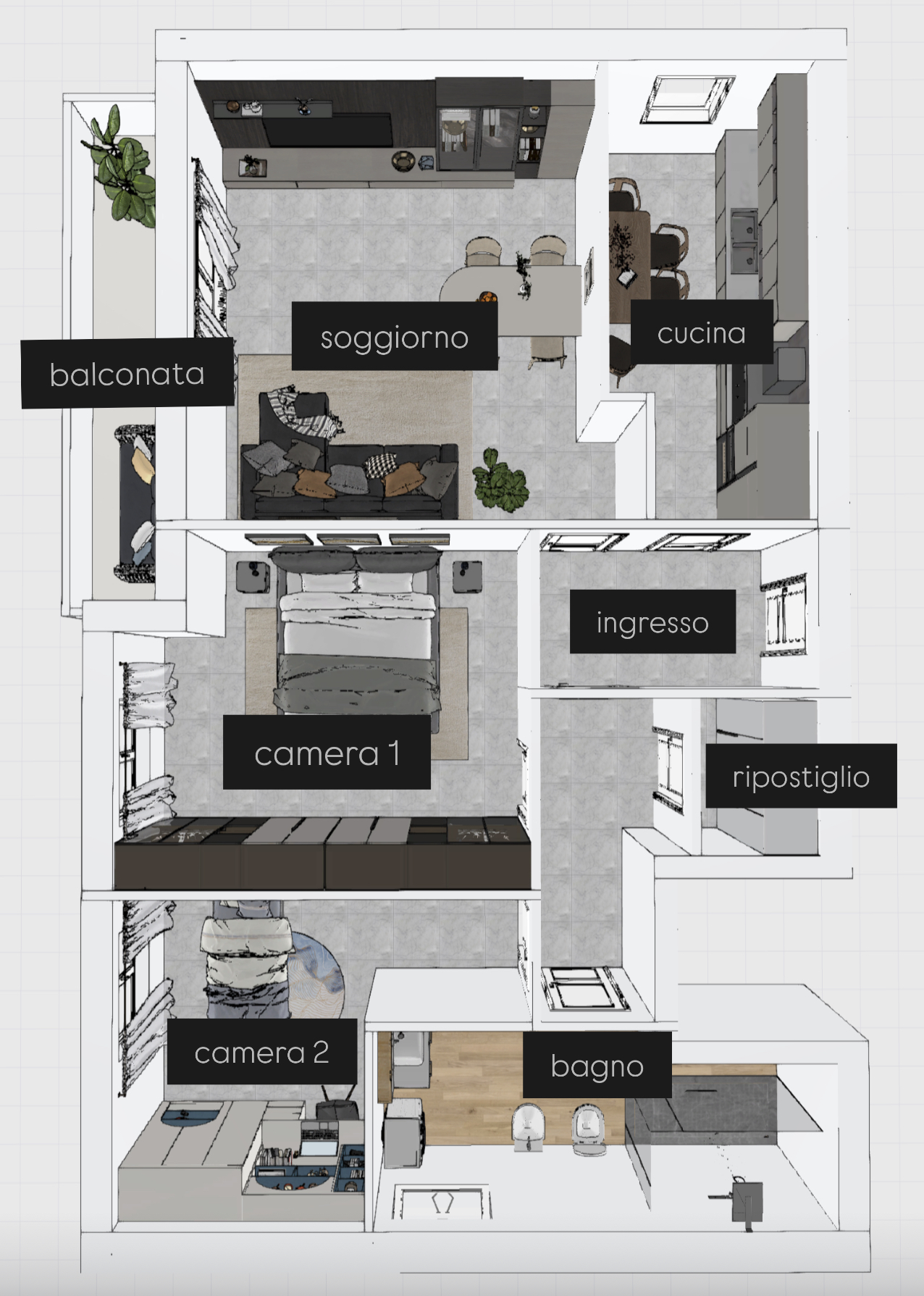 L’immobile è composto da disimpegno d’ingresso, soggiorno con accesso diretto all’ampia balconata, cucina abitabile, zona notte con camera da letto 1 e camera da letto 2 e bagno finestrato con doccia.