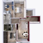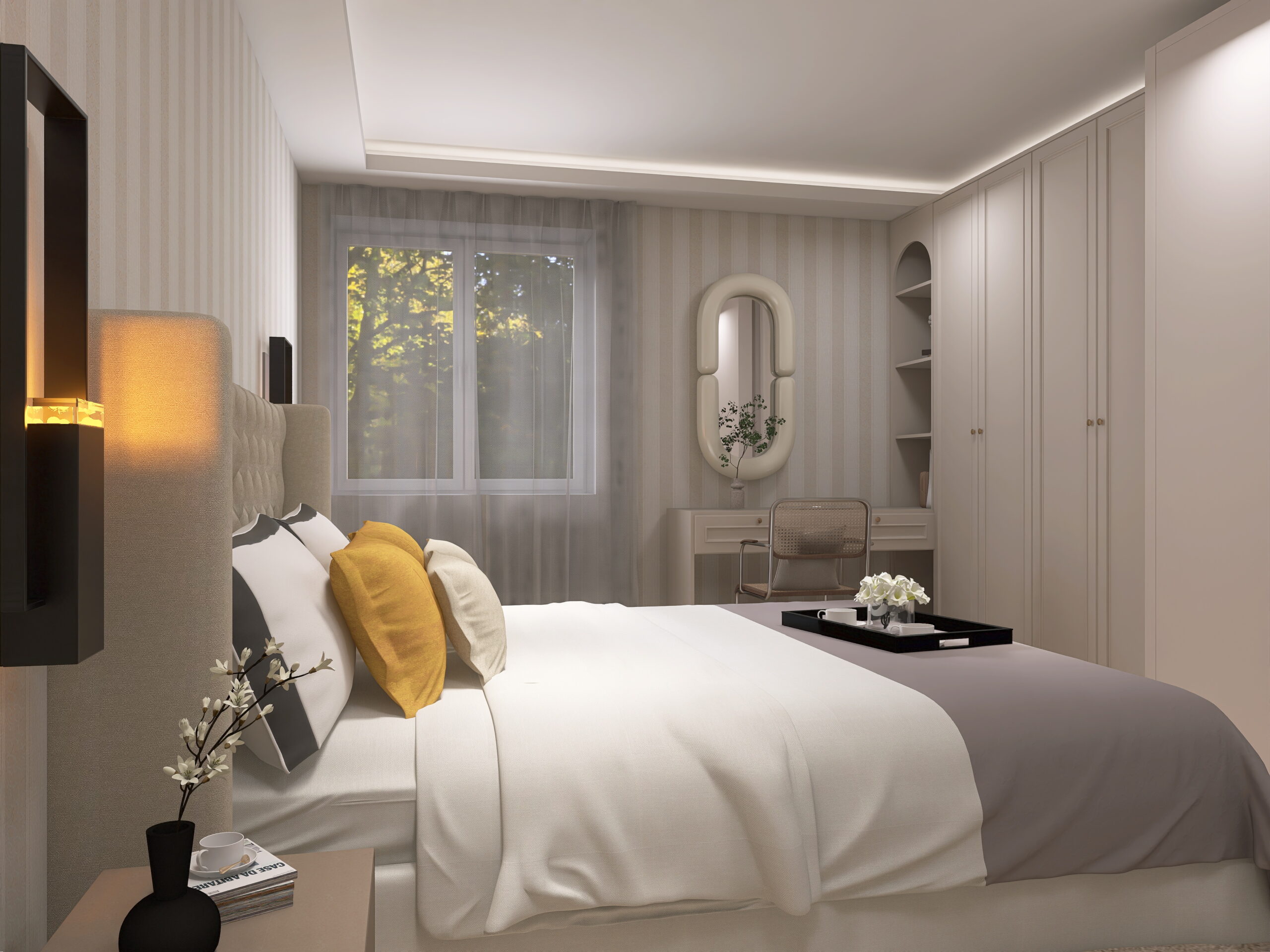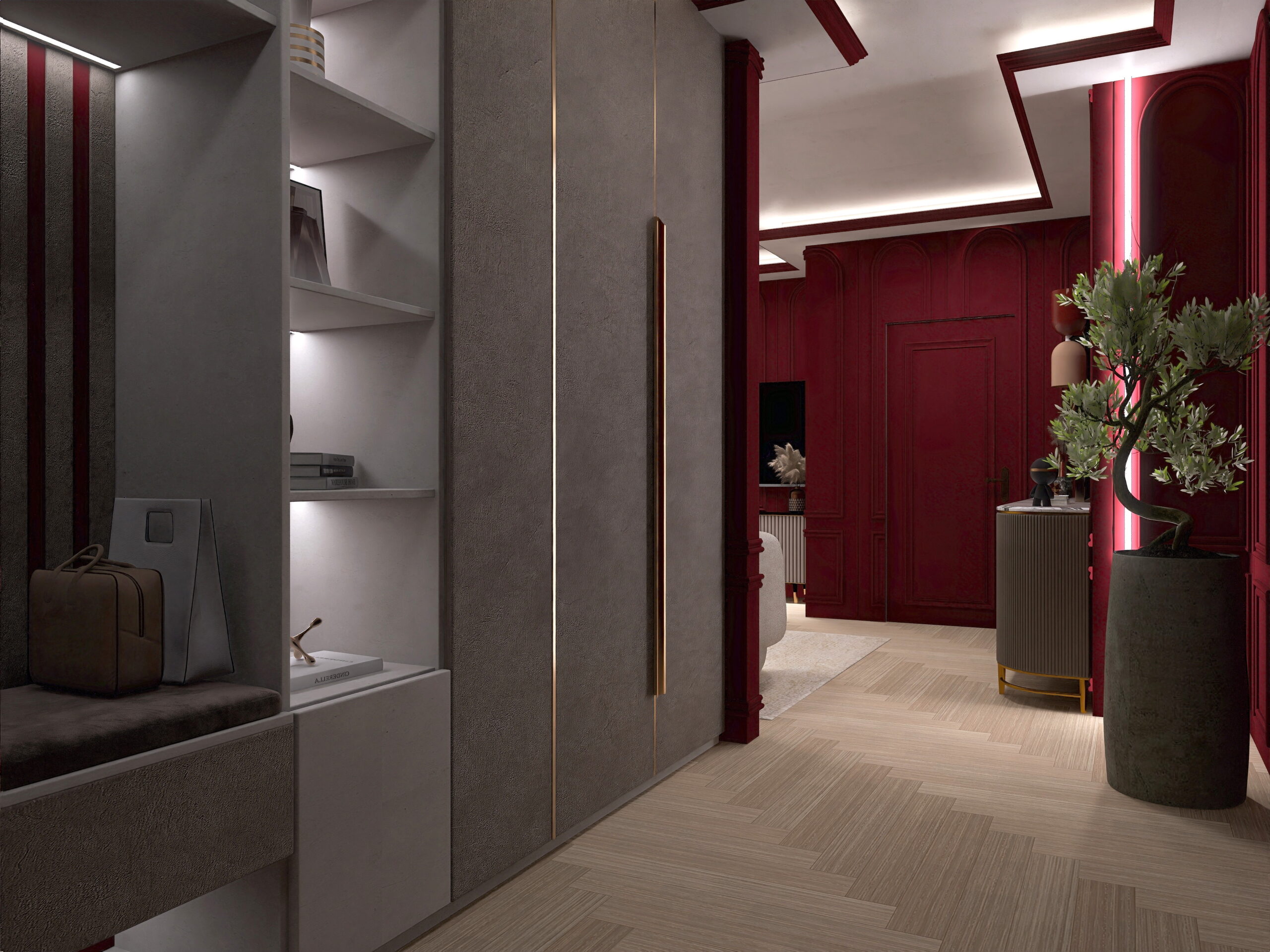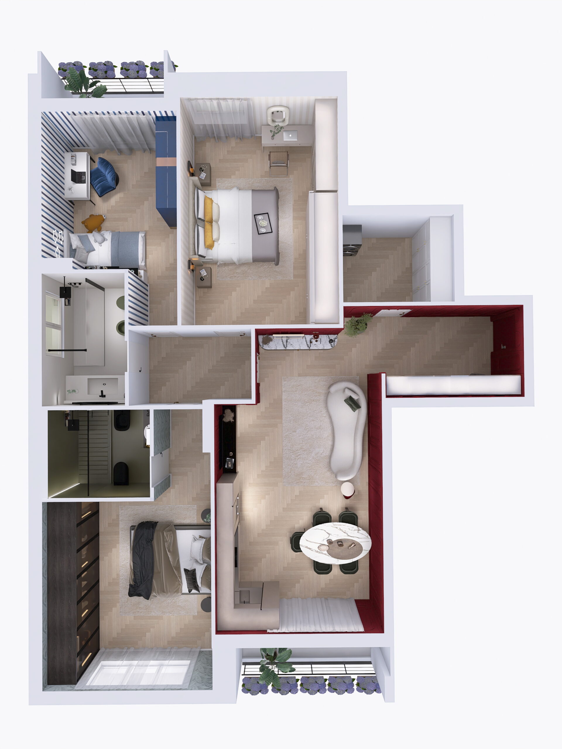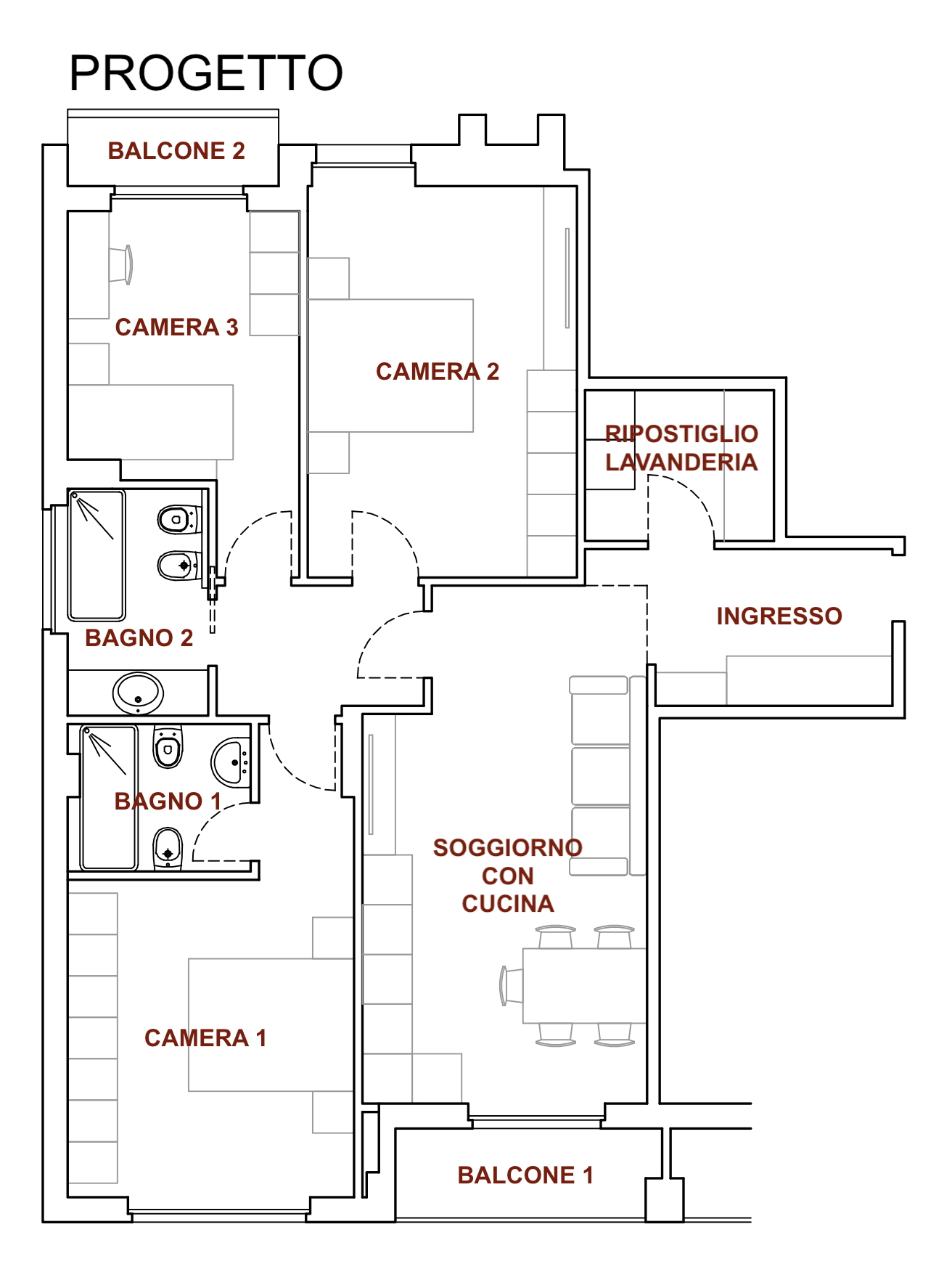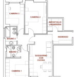 il progetto prevede la suddivisione degli spazi interni (vedi progetto pubblicato) in soggiorno con cucina a vista ed accesso diretto al balcone 1, camera padronale 1 con bagno 1 en-suite con doccia, camera da letto matrimoniale 2, bagno 2 finestrato con doccia, camera da letto 3 con accesso al balcone 3 e ripostiglio/lavanderia