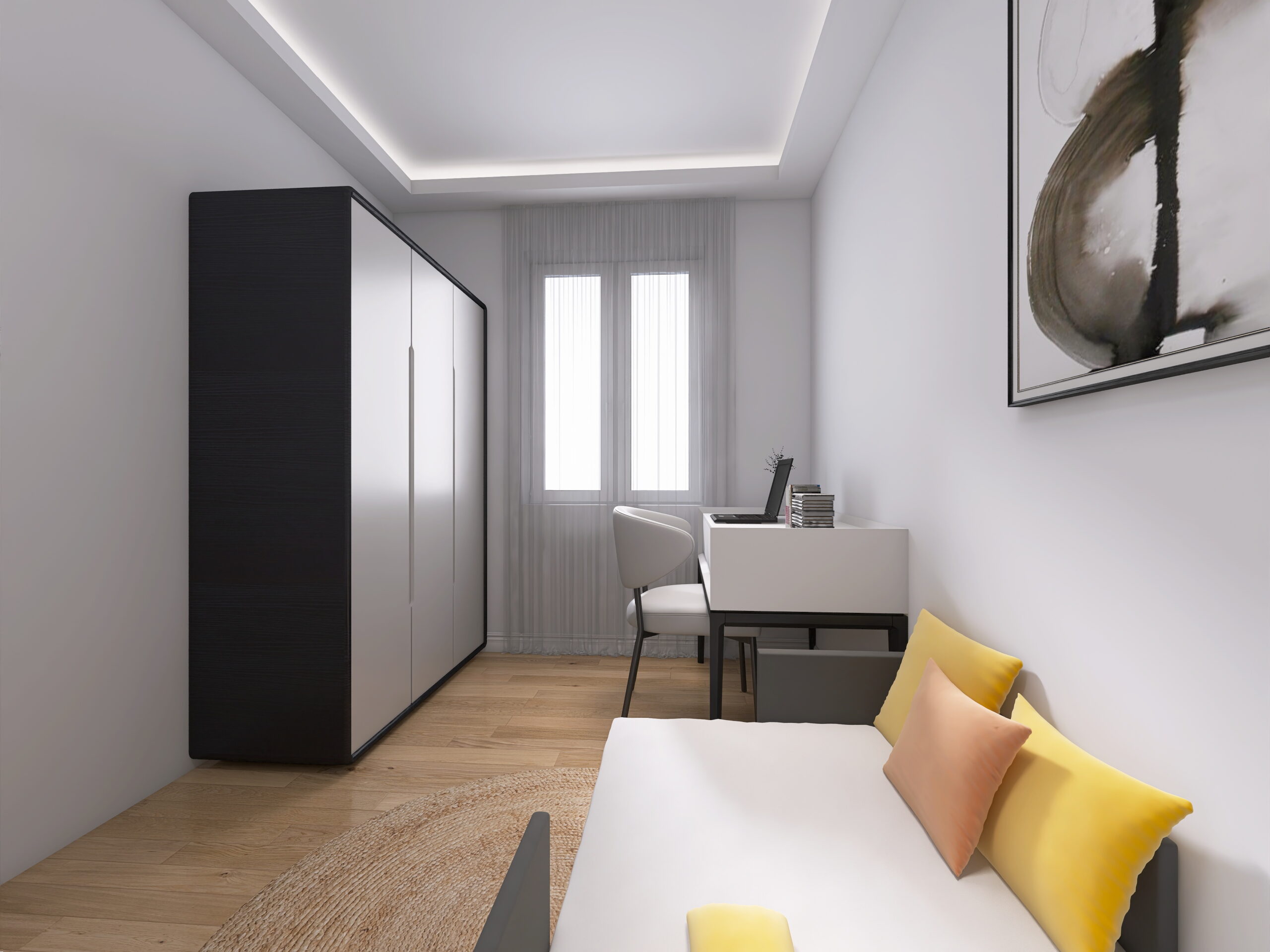 disimpegno d’ingresso, soggiorno con cucina a vista, camera da letto 1 con bagno 1 en-suite, camera da letto 2, studio/cameretta (3) e bagno 2 finestrato