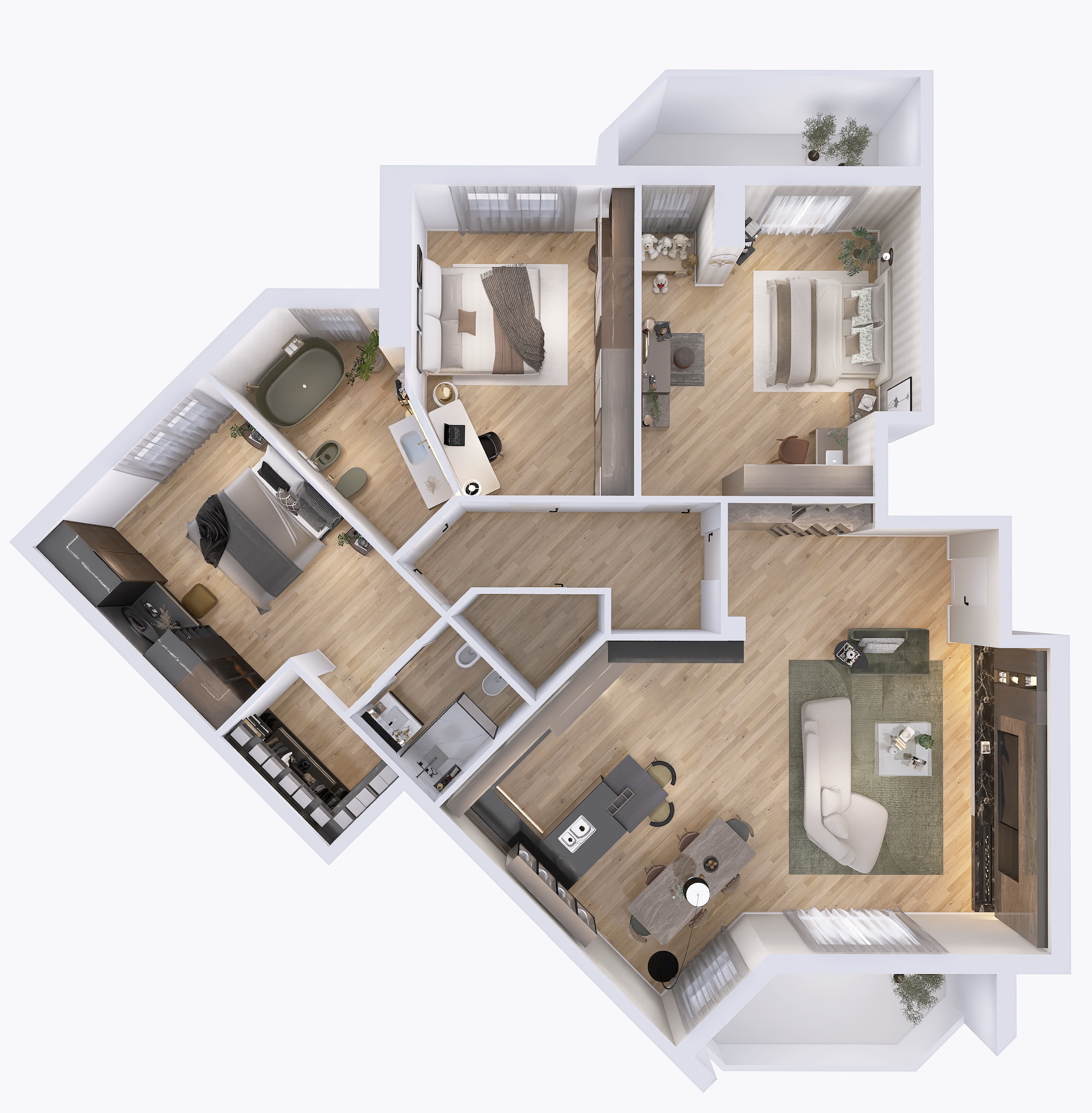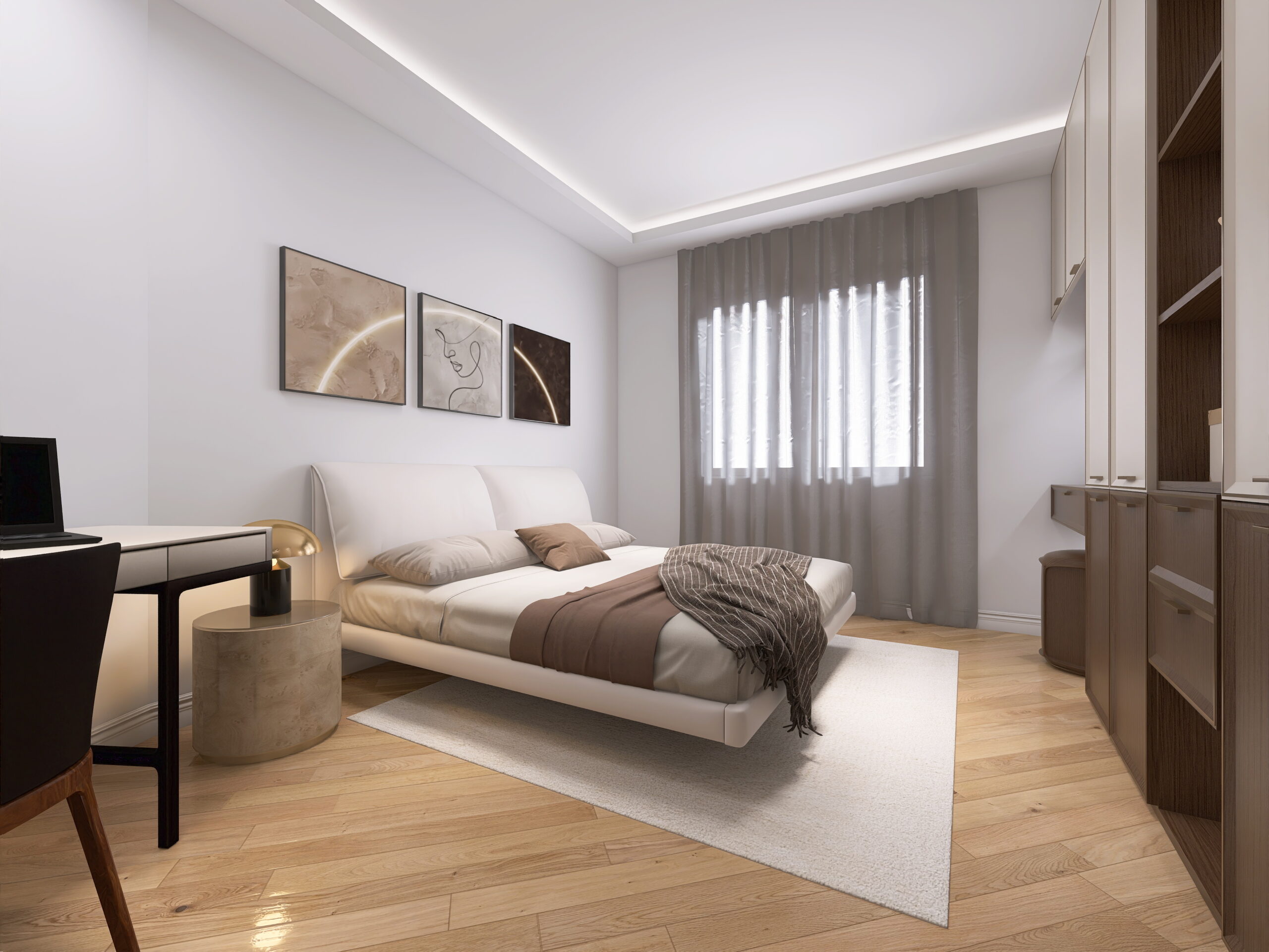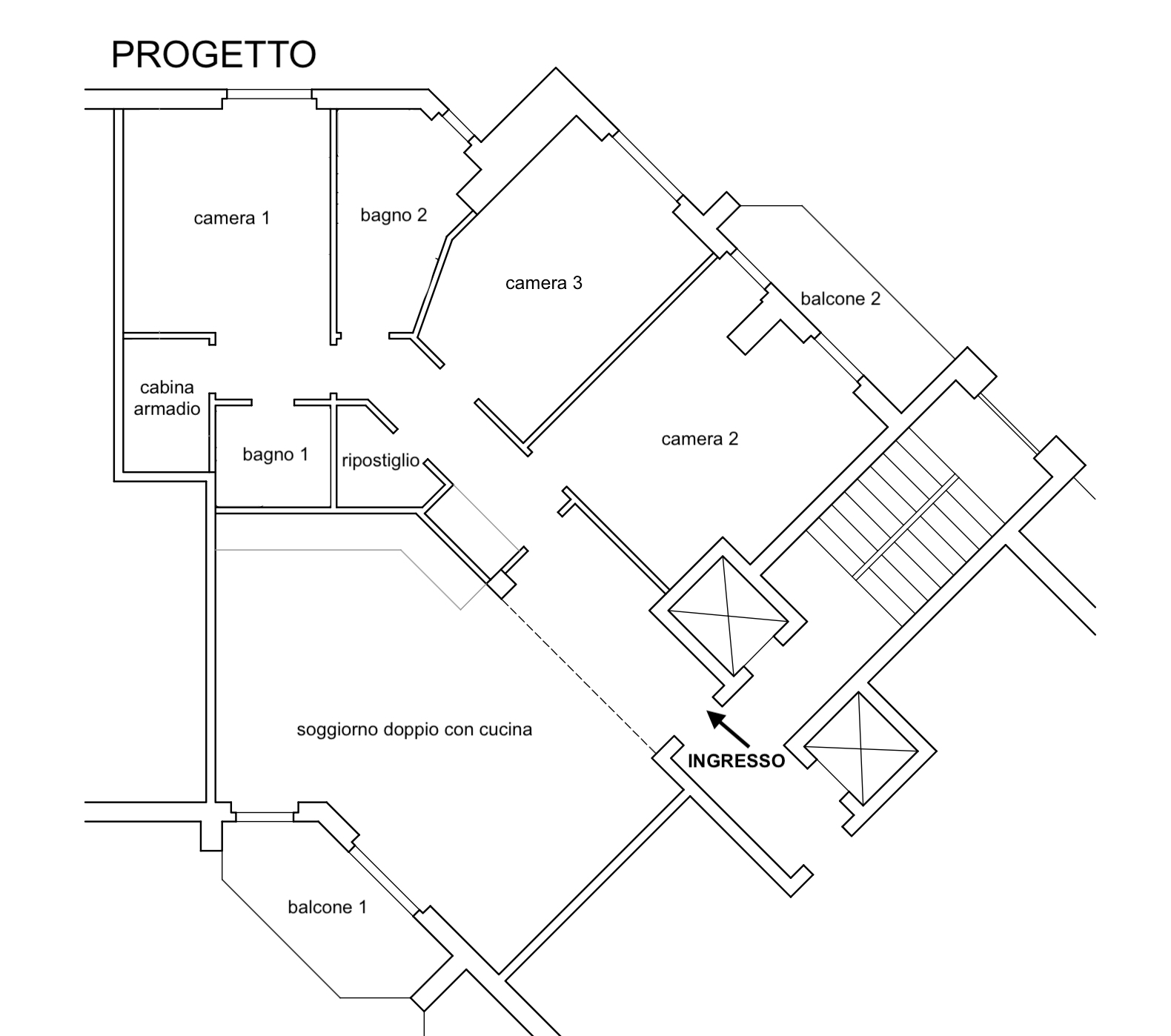 il progetto prevede la suddivisione degli spazi interni (vedi progetto pubblicato) in soggiorno doppio con cucina a vista ed accesso al balcone 1, camera 1 matrimoniale con cabina armadio e bagno en-suite, camera matrimoniale 2 con accesso al balcone 2, bagno 2 finestrato con vasca, camera matrimoniale 3 e ripostiglio/lavanderia