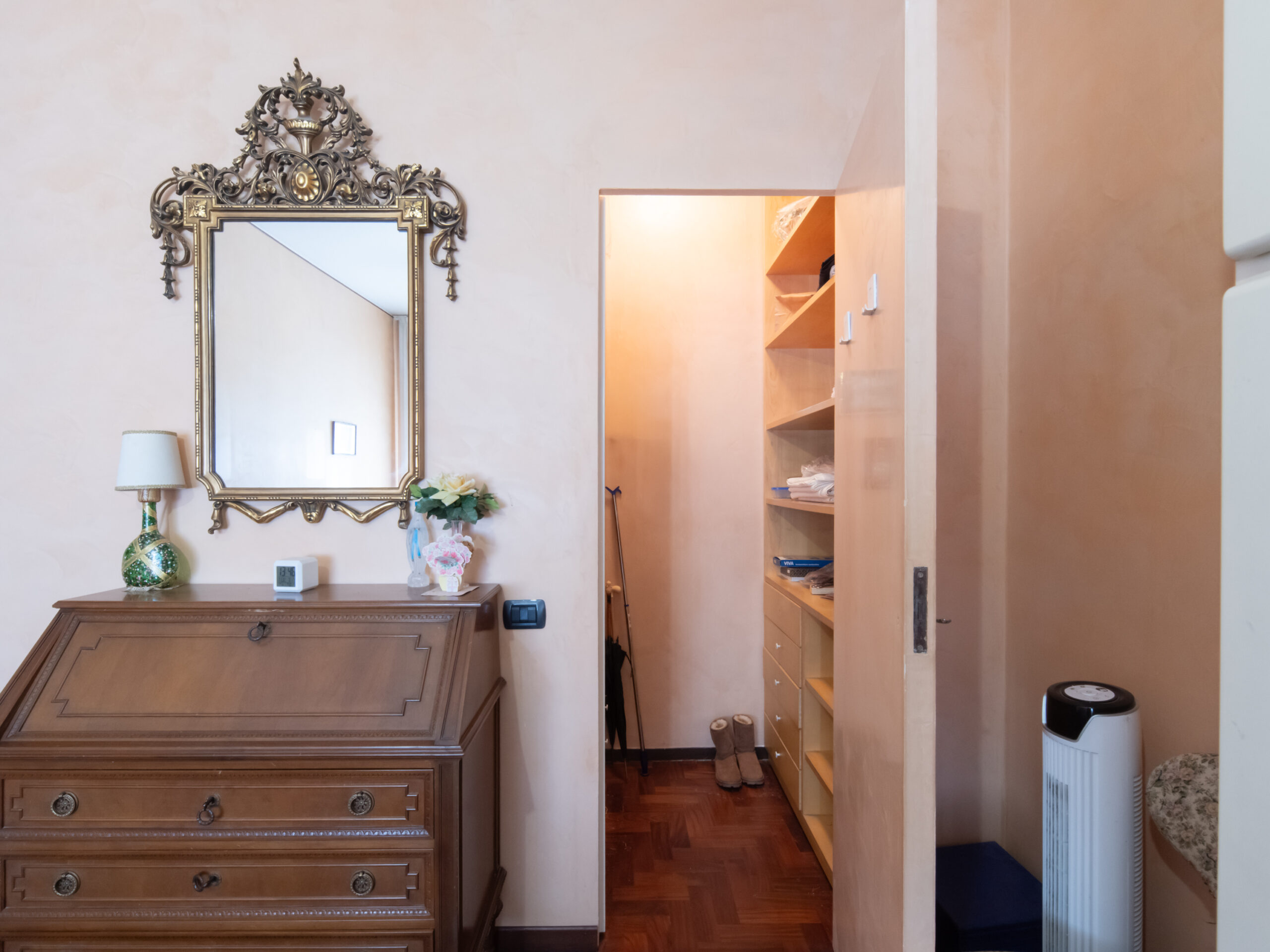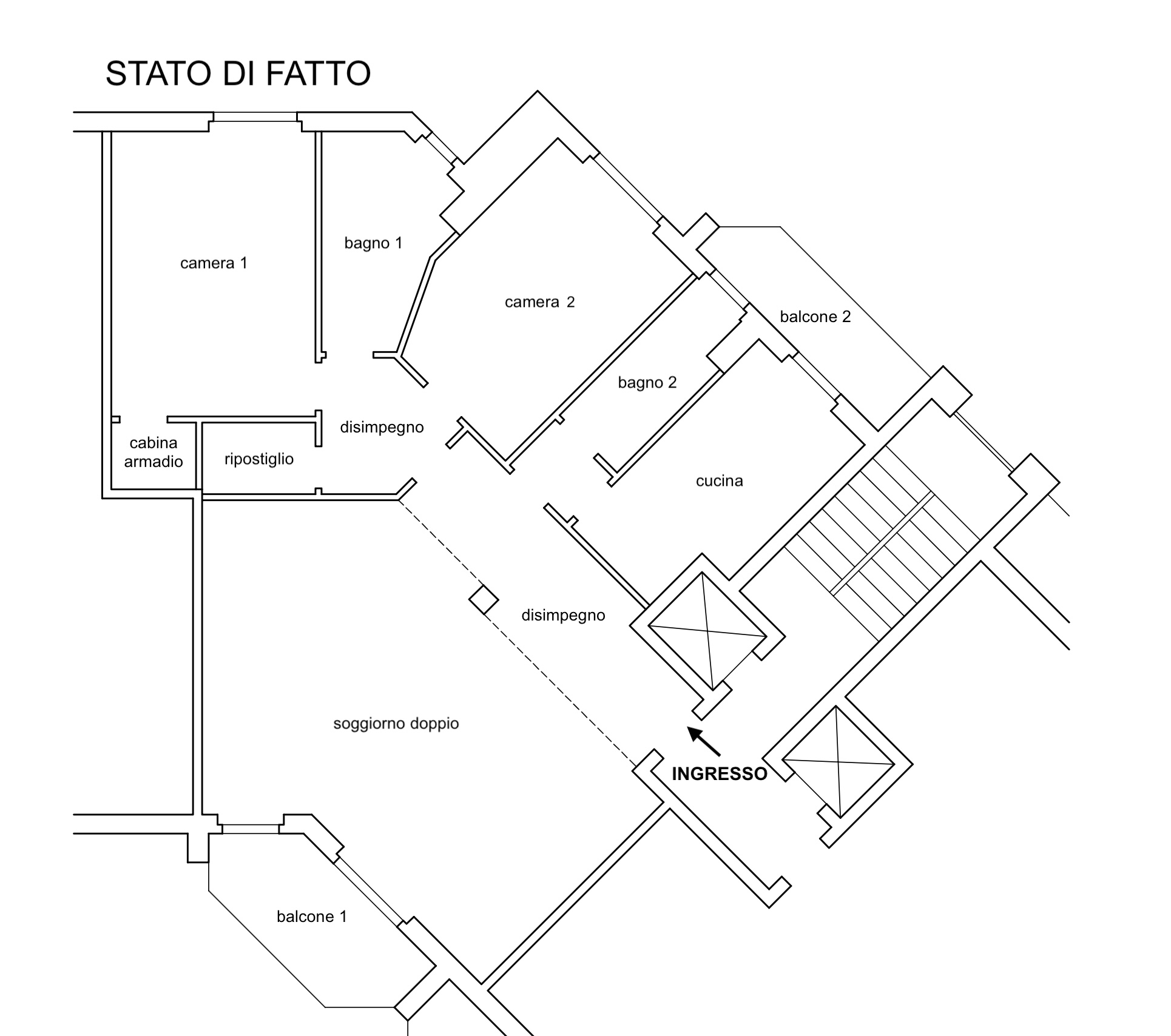 l’immobile è attualmente composto da ampio disimpegno d’ingresso, soggiorno doppio con accesso diretto al balcone 1, cucina abitabile con accesso al balcone 2, camera matrimoniale 1 con cabina armadio, ampio bagno 1 finestrato con vasca, camera matrimoniale 2, bagno 2 finestrato con doccia e ripostiglio