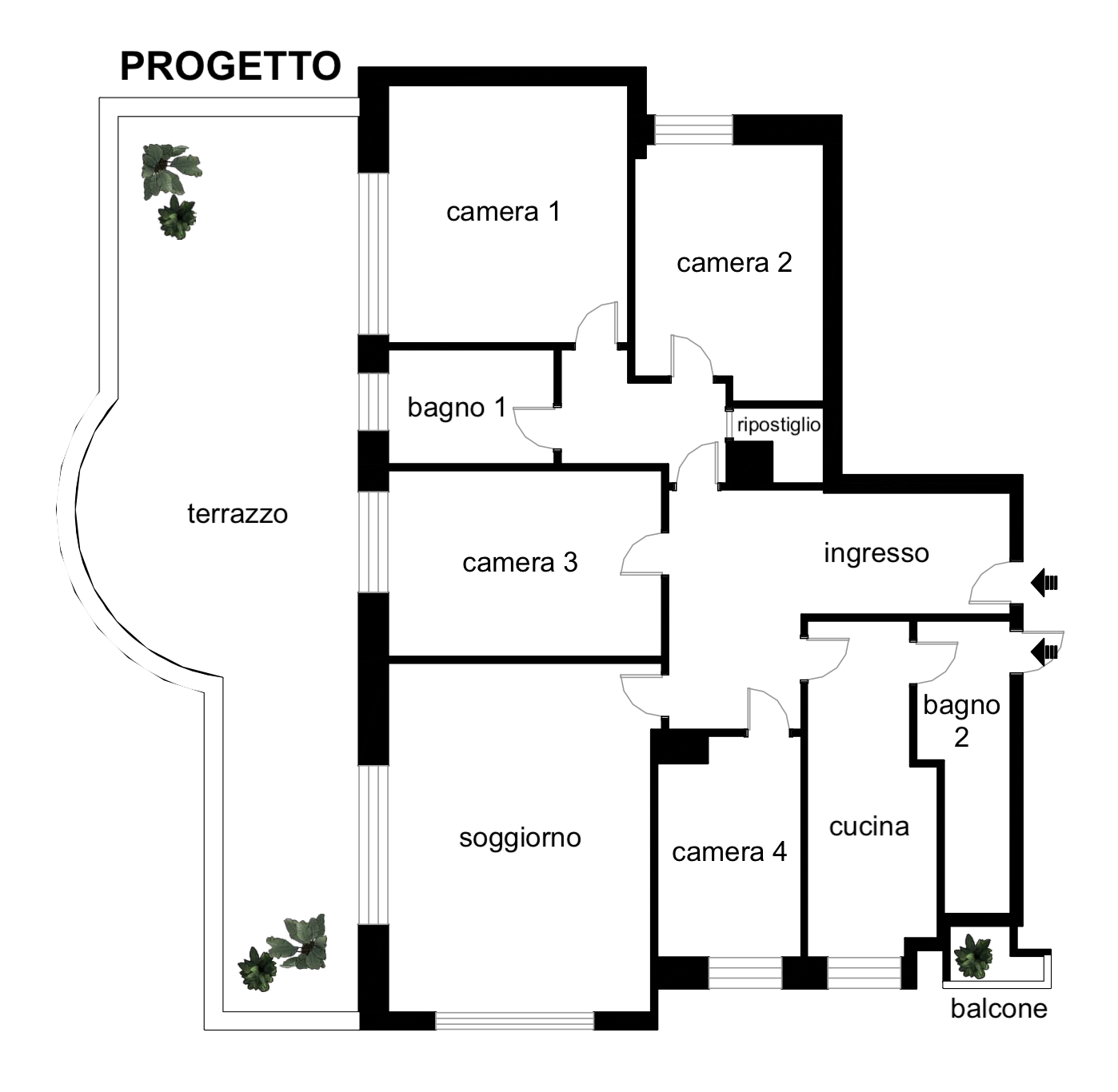 il progetto prevede la suddivisione degli spazi interni (vedi progetto pubblicato) in ampio disimpegno d’ingresso, soggiorno con accesso diretto al terrazzo, cucina abitabile, camera da letto 1 con accesso diretto al terrazzo, bagno 1 finestrato, camera da letto 2, bagno 2 con accesso diretto al balcone, camera da letto 3, camera da letto 4 e ripostiglio.