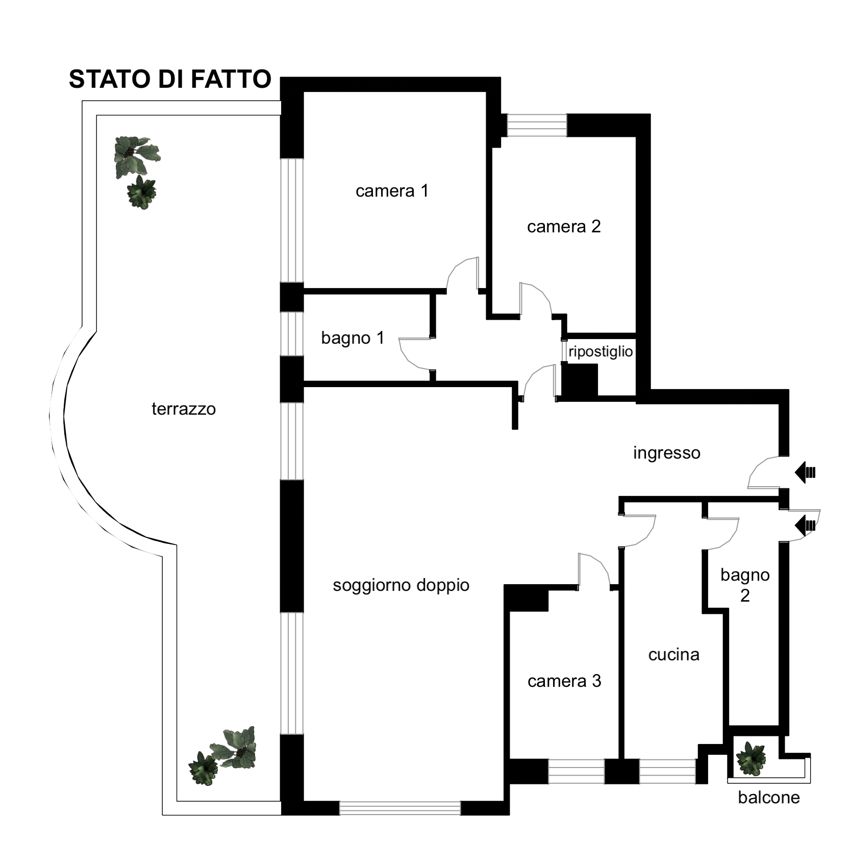 l’immobile è attualmente composto da doppio ingresso, ampio disimpegno d’ingresso, soggiorno doppio con accesso diretto al terrazzo, cucina abitabile, camera matrimoniale 1 con accesso diretto al terrazzo, bagno 1 finestrato, camera da letto 2, bagno 2 con accesso al balcone, camera da letto 3 e ripostiglio.