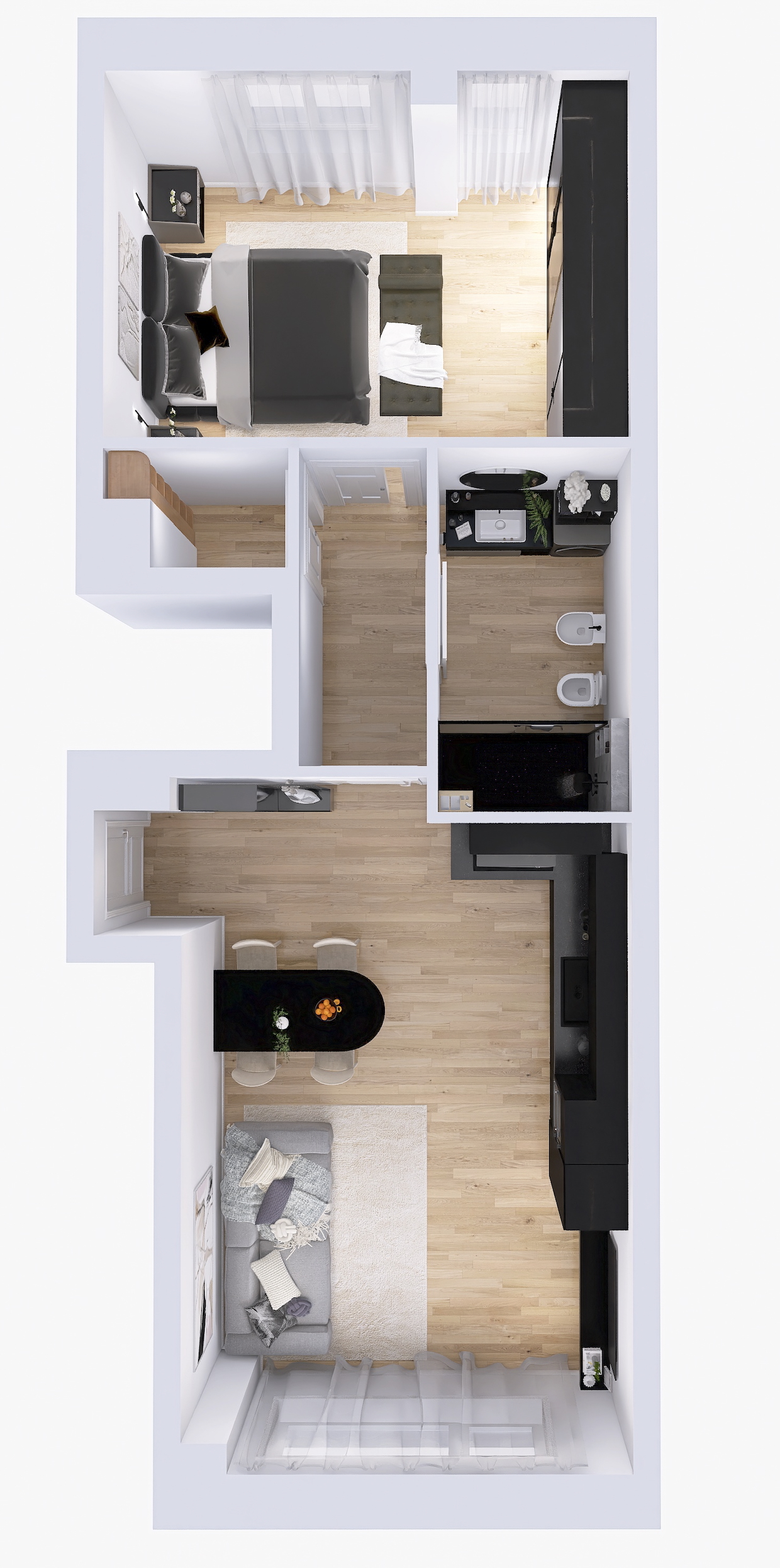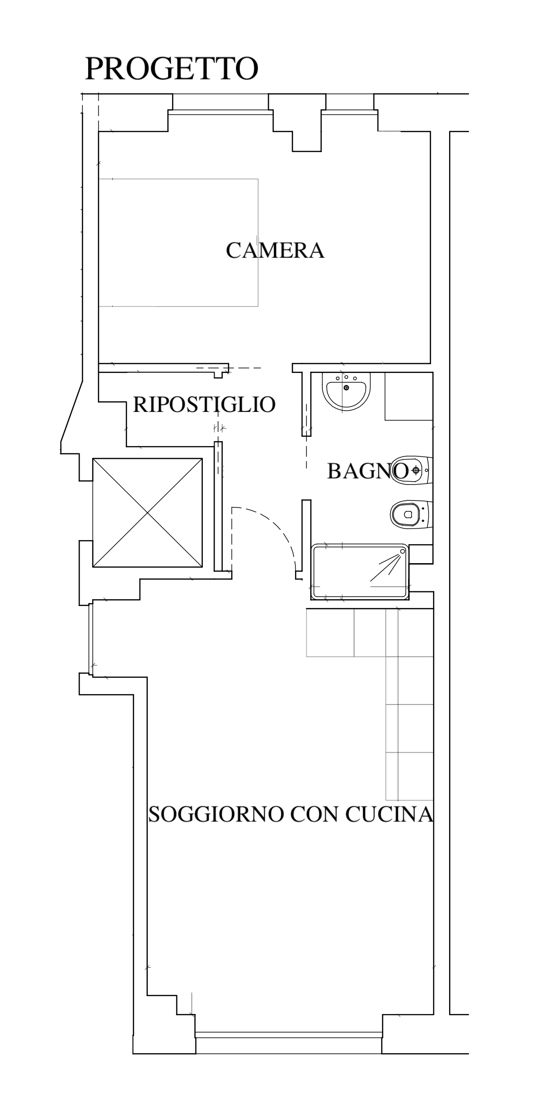 il progetto prevede la suddivisione degli spazi interni (vedi progetto pubblicato) in soggiorno con cucina a vista, ampia camera matrimoniale, bagno con doccia e ripostiglio