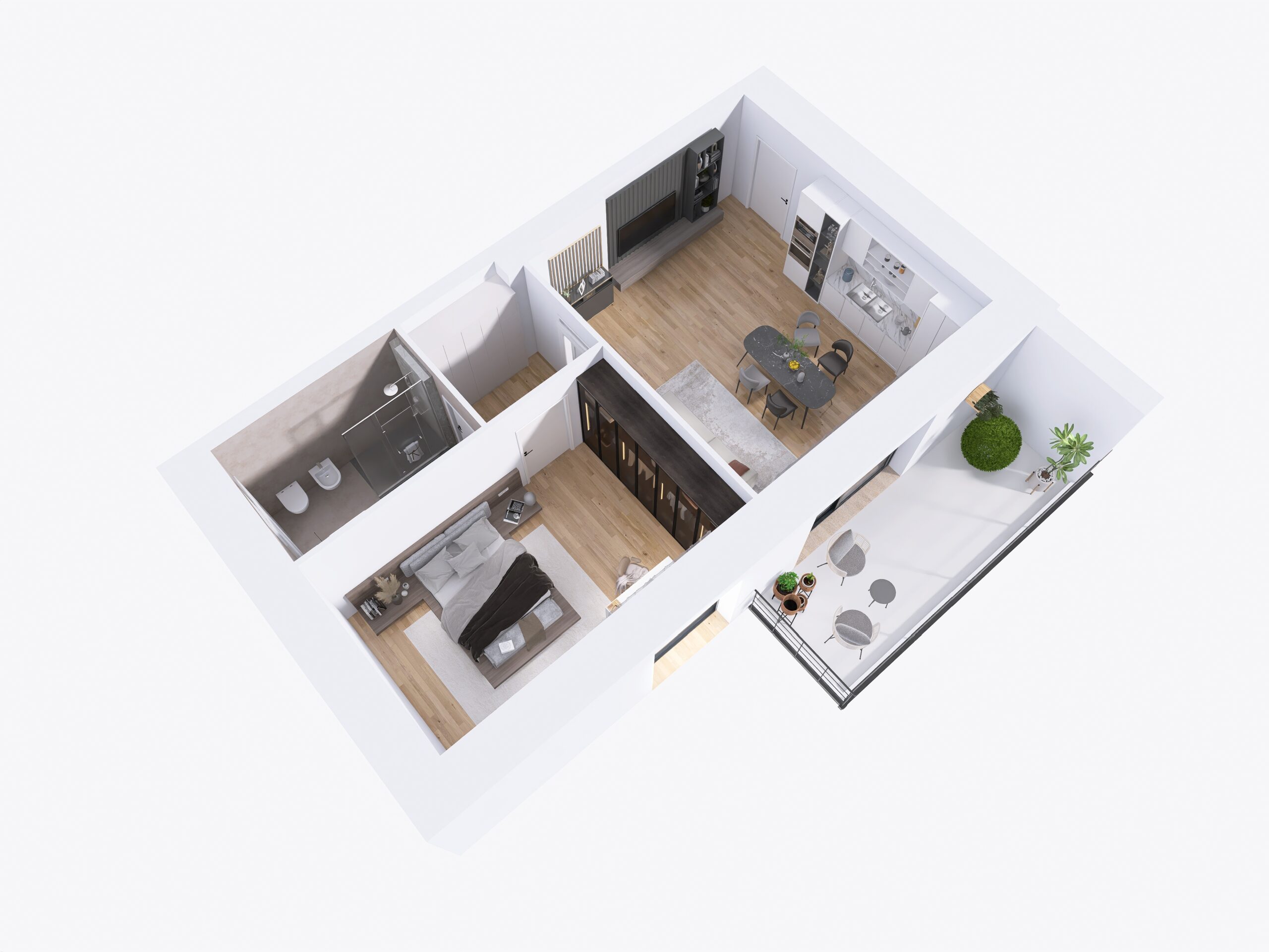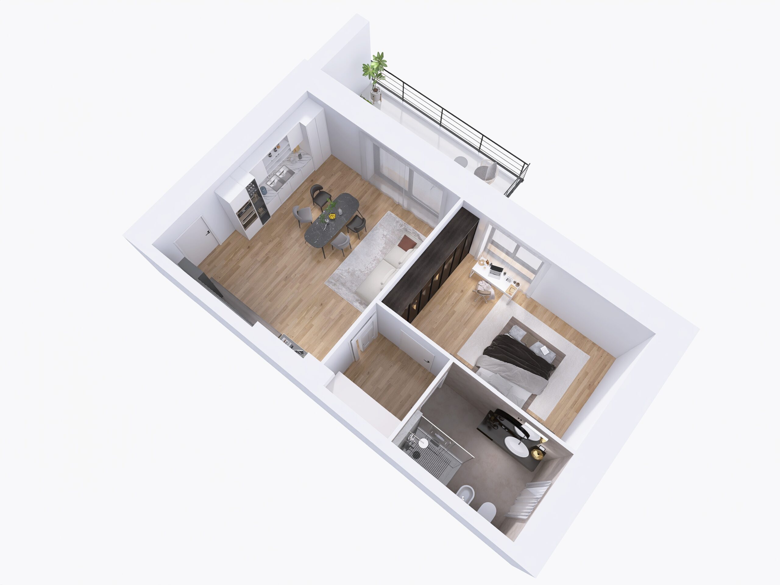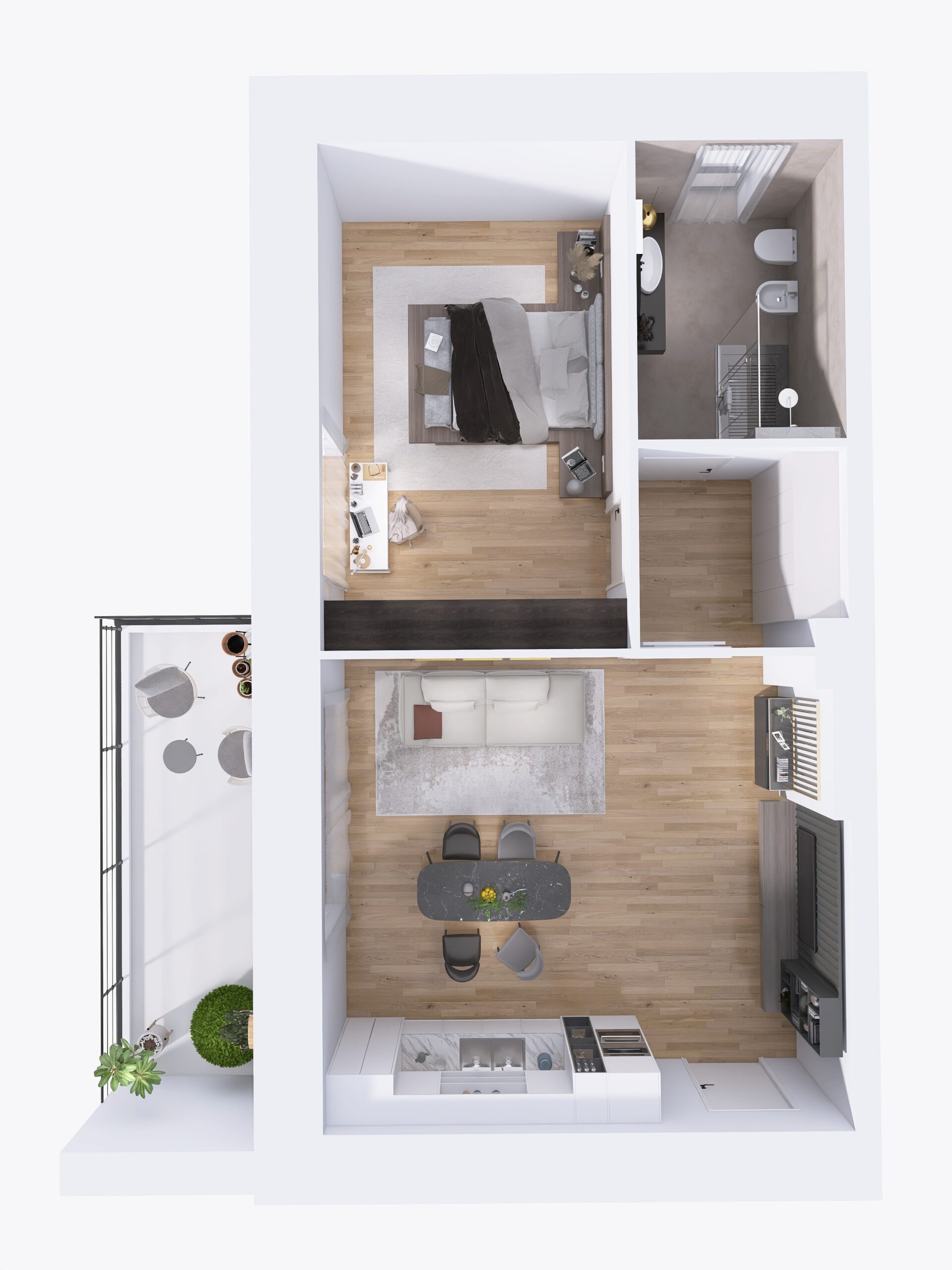 l’immobile è composto da ingresso, soggiorno con cucina a vista ed accesso diretto al terrazzo, ampia camera matrimoniale, disimpegno e bagno finestrato con doccia