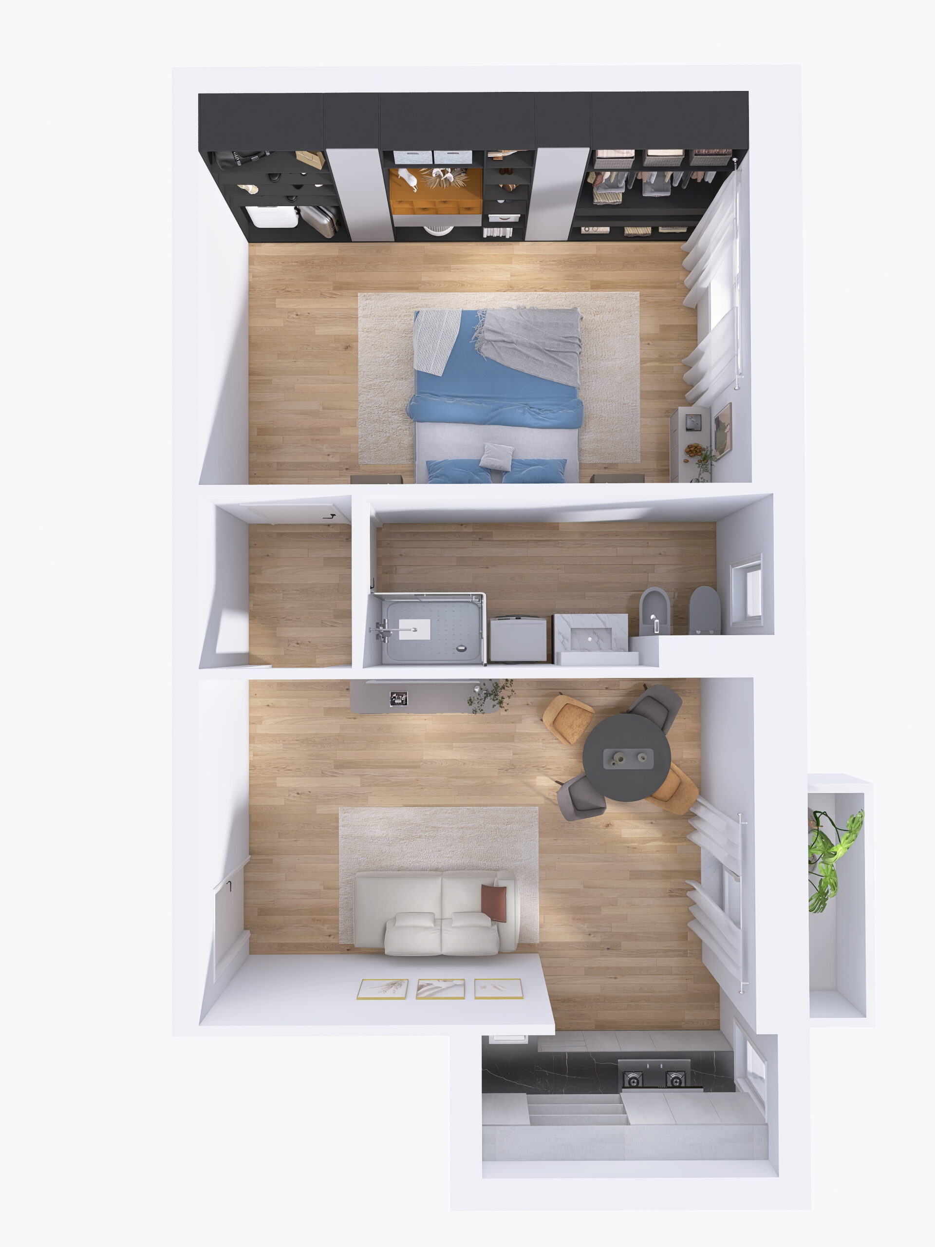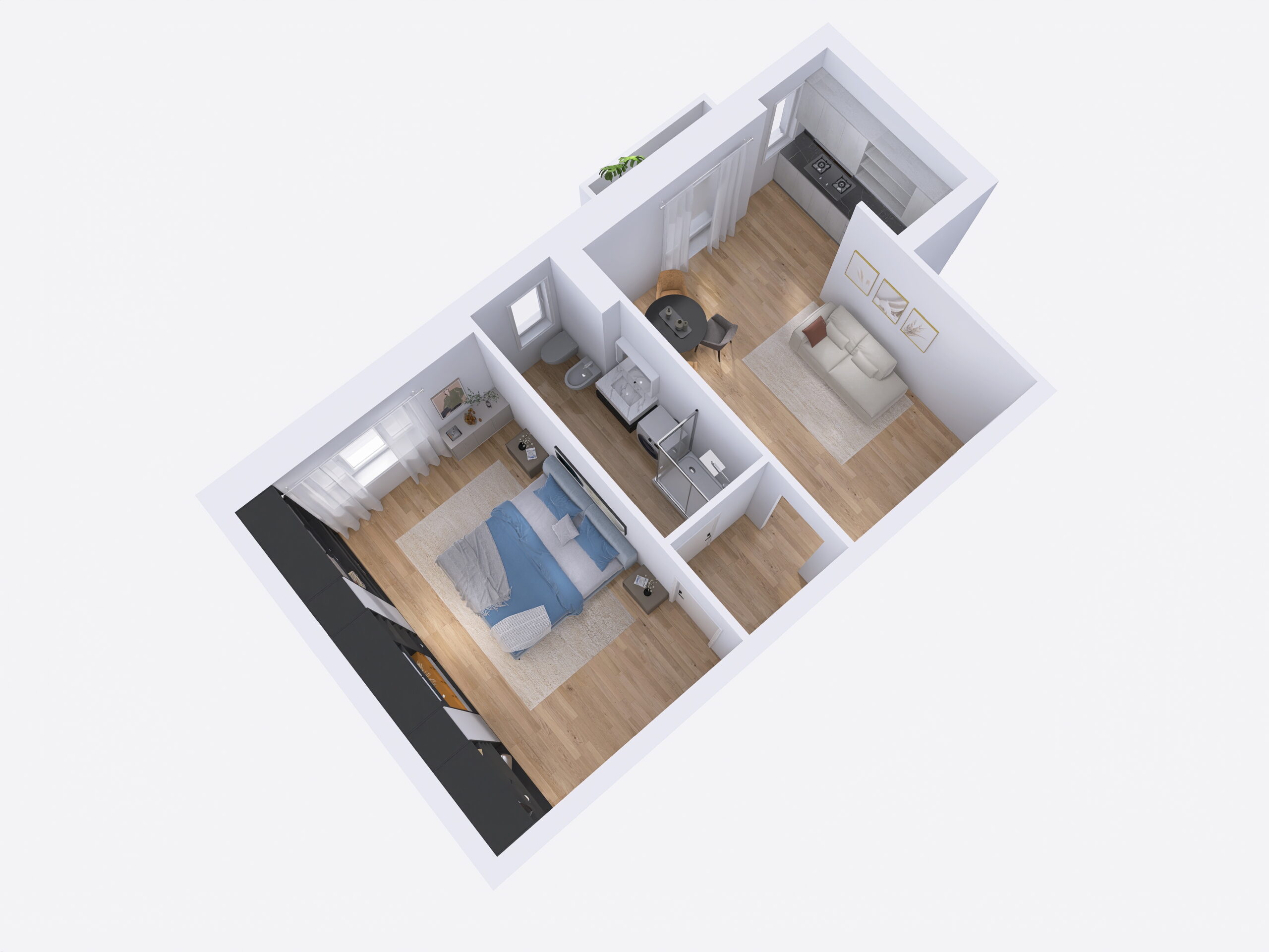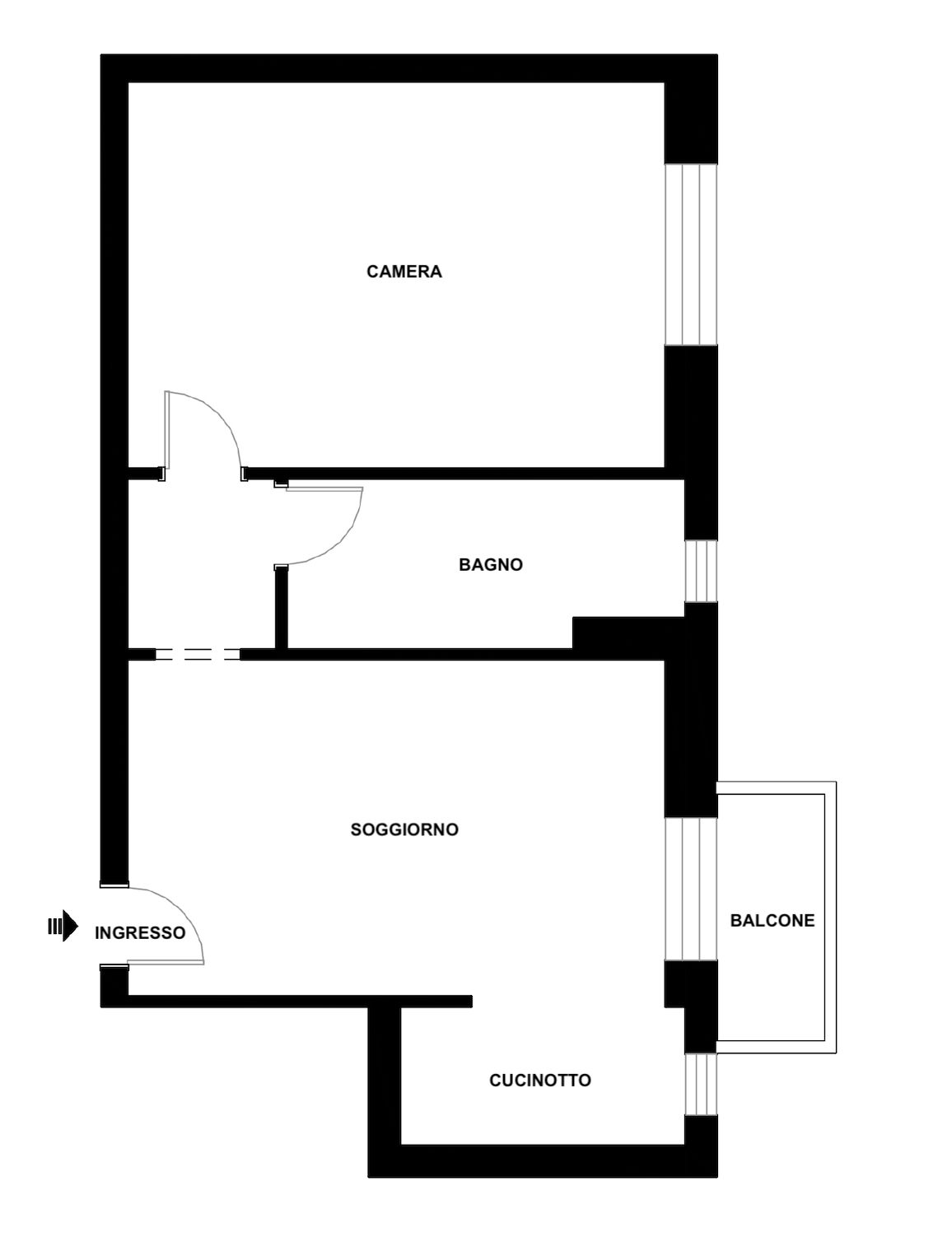 l’immobile è composto da ingresso, soggiorno con accesso diretto al balcone, cucinotto finestrato, ampia camera da letto e bagno finestrato