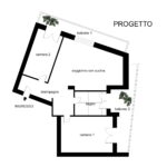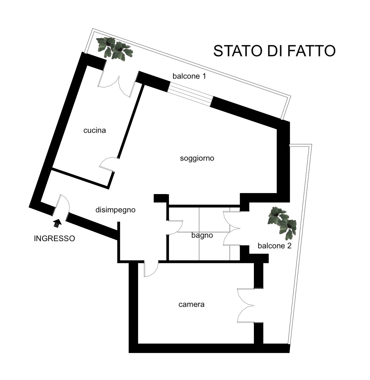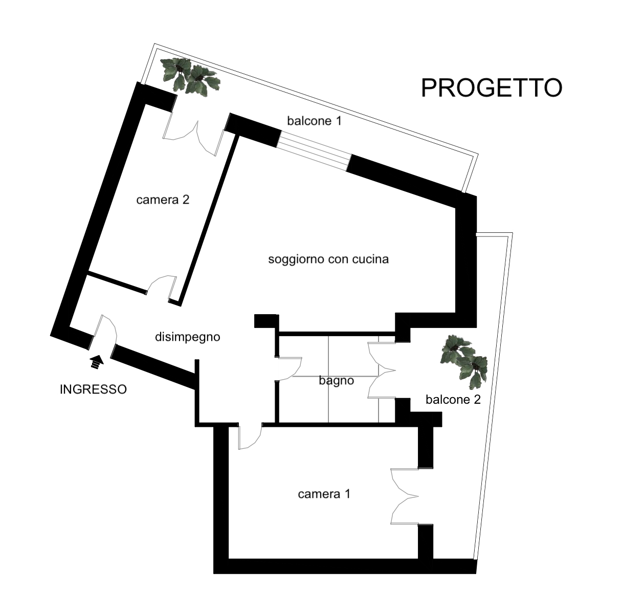 ingresso, ampio soggiorno, cucina abitabile con accesso al balcone 1, camera da letto con accesso diretto al balcone 2 e bagno grande con doccia e accesso al balcone 2